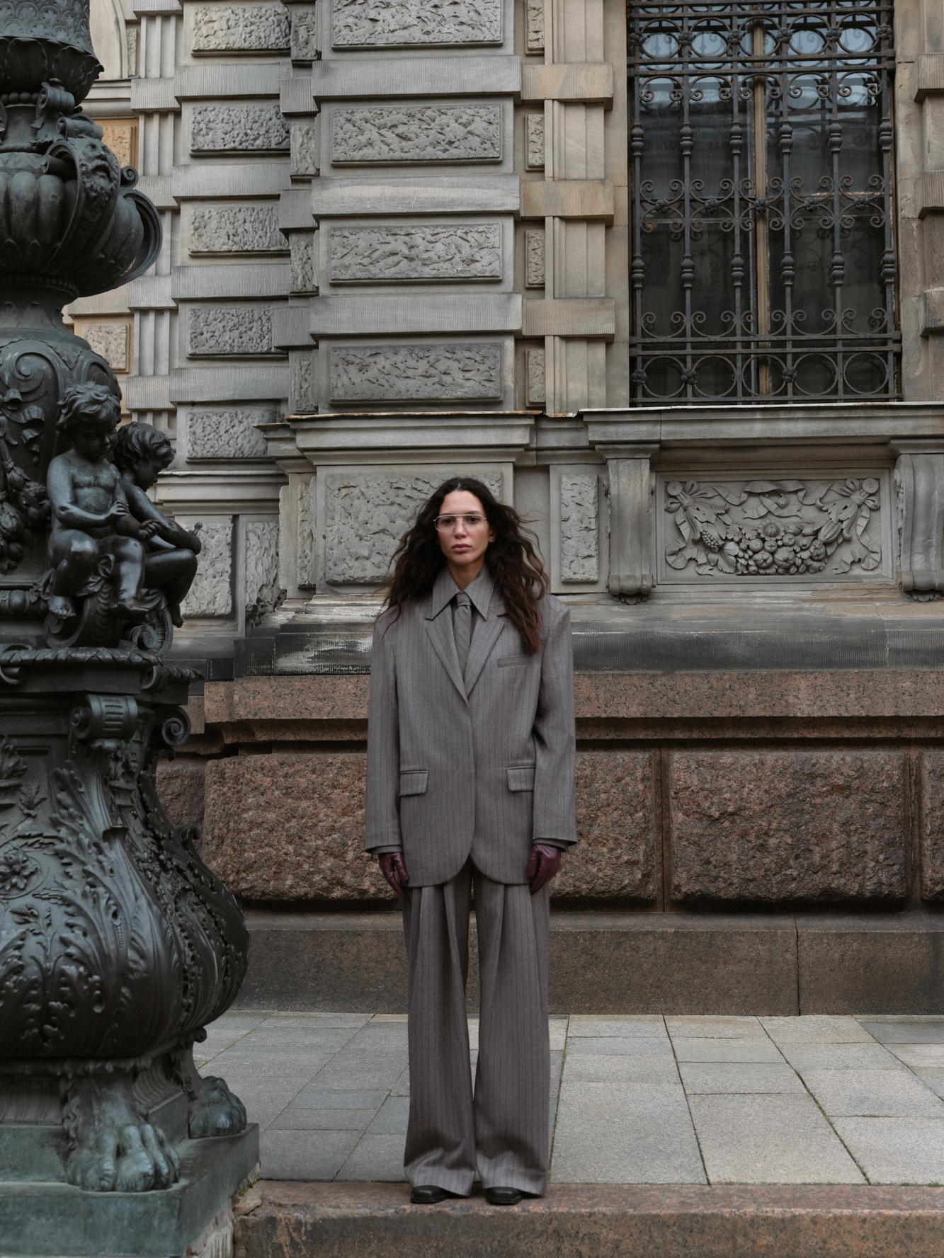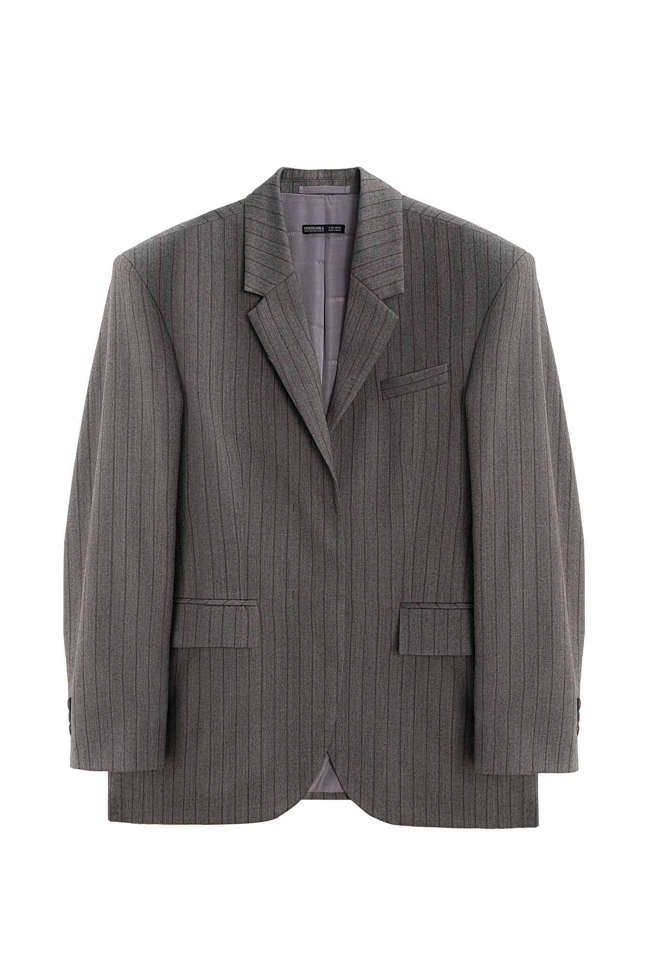 Однобортный жакет в полоску. Модель прямого кроя, с узкими лацканами, нагрудным карманом, боковыми карманами с клапанами и пуговицами на рукавах. Застежка на скрытые пуговицы под планкой. Изделие выполнено на подкладке.