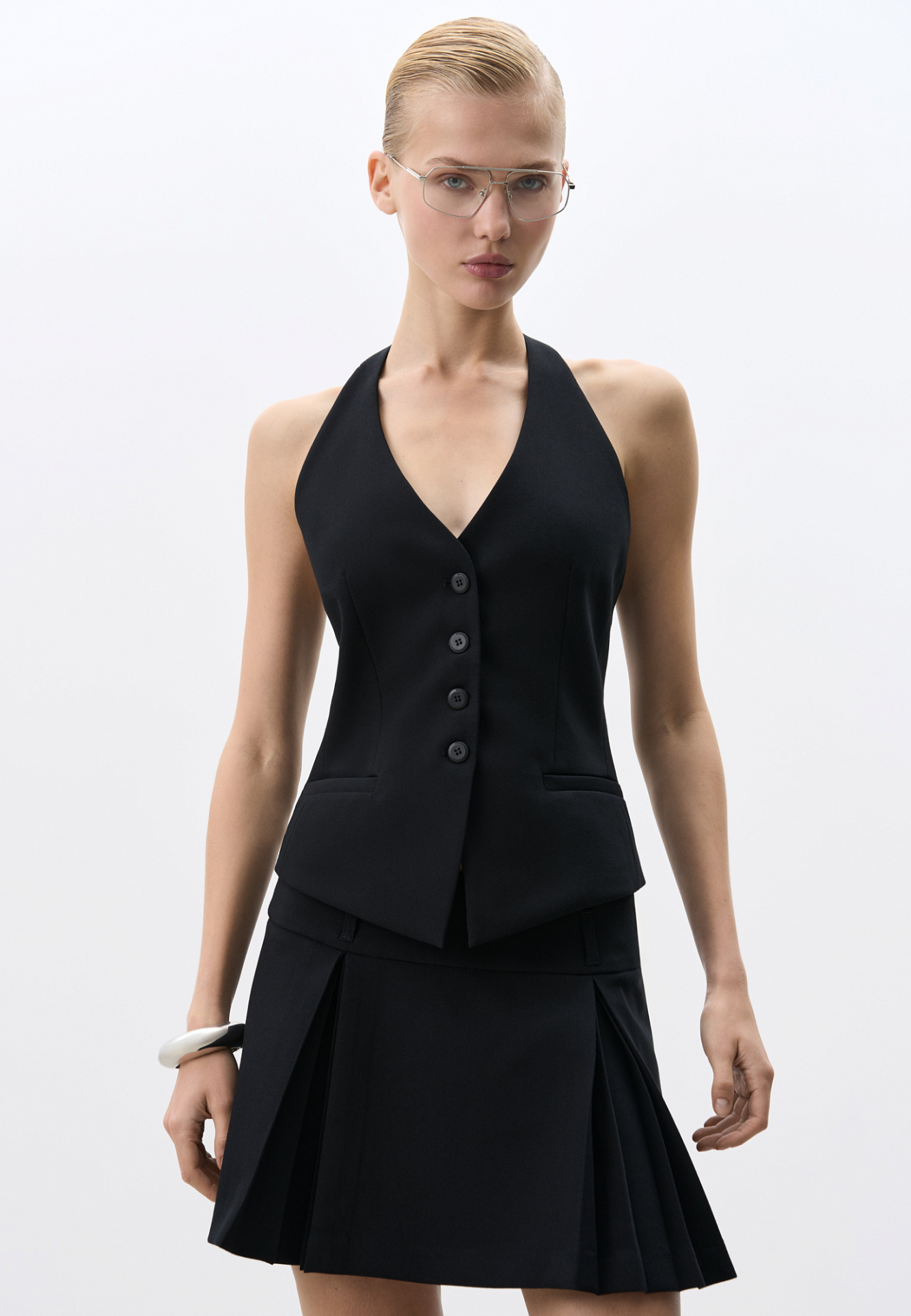 Жилет из поливискозы с открытой спиной. Модель прителенного силуэта, с глубокой проймой, V-образным вырезом горловины и прорезными карманами. Застежка на пуговицы.