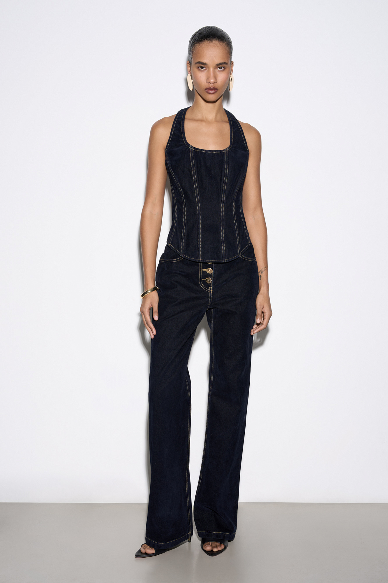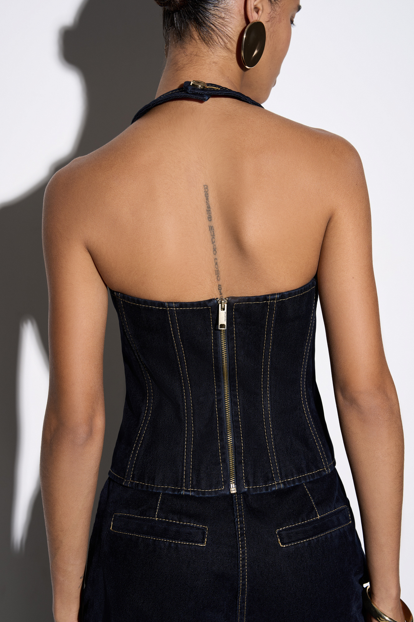 Джинсовый корсет из флокированного денима - 100% хлопка с имитацией бархатной текстуры. Модель с акцентными строчками контрастного цвета, открытой спиной и вырезом халтер. Застежка на молнию по спинке и пуговицу на шее.