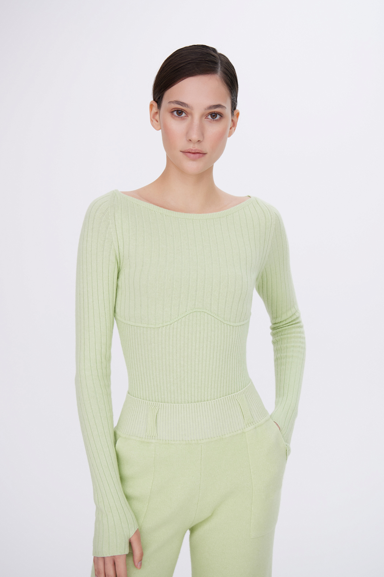 Трикотажное боди в широкий рубчик из смесовой шерсти. Модель с длинными рукавами и круглым вырезом горловины.