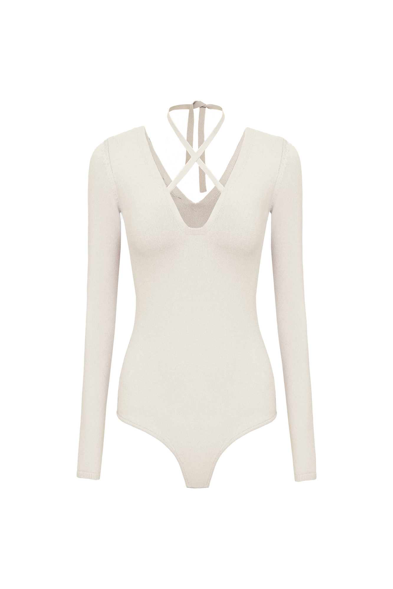 Трикотажное боди из вискозы с акцентным вырезом и лентой-завязкой на шее.