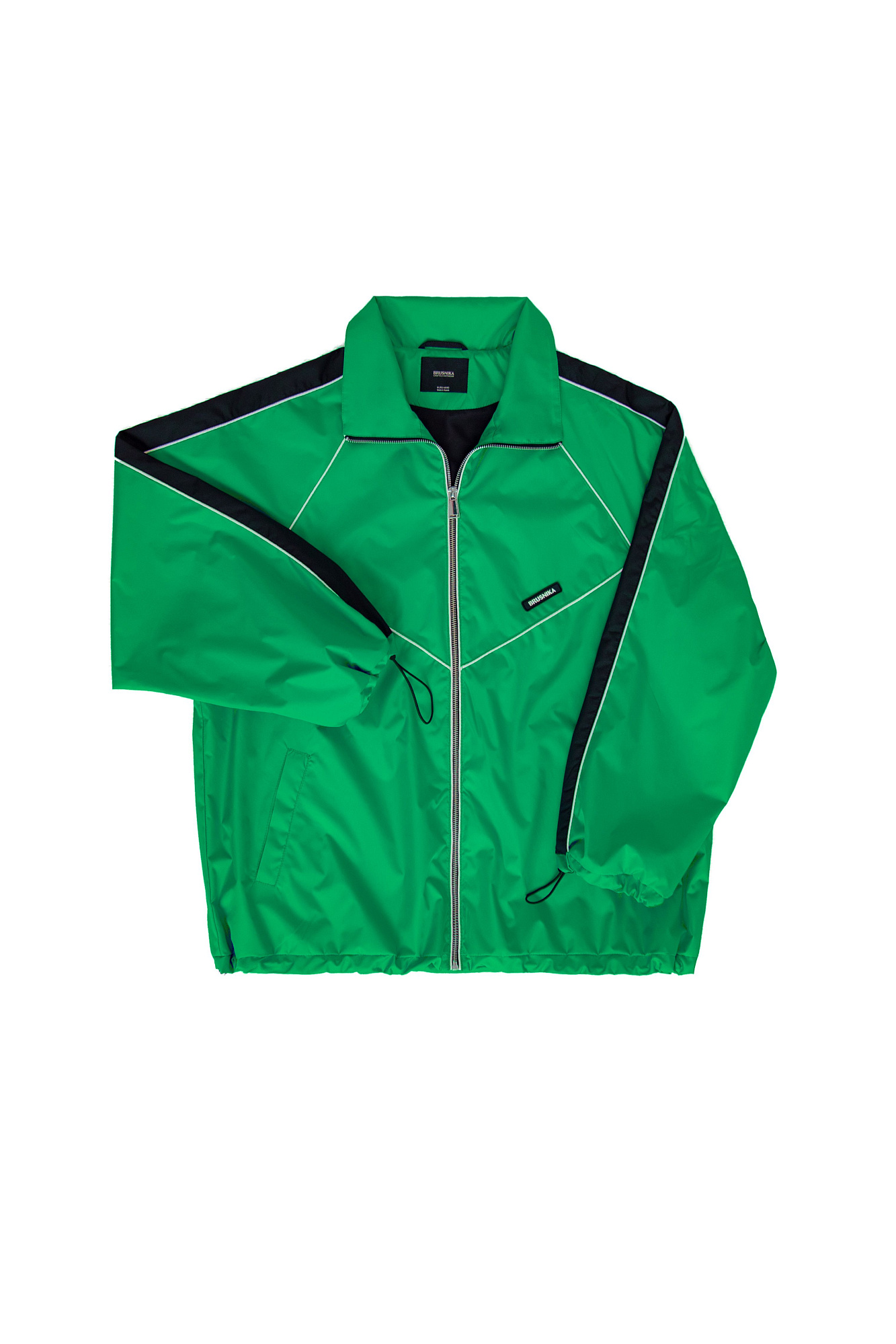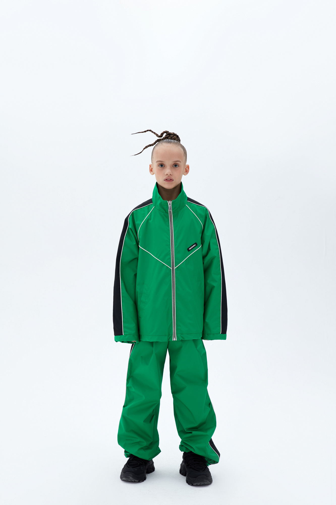 Детская куртка в спортивном стиле с карманами по бокам, голубым кантом и широким лампасом. Брендированный ярлык на груди. Подклад с элементами из сетчатой ткани по бокам и воротник-стойка. Дополнить образ можно брюками или шортами в таком же стиле.