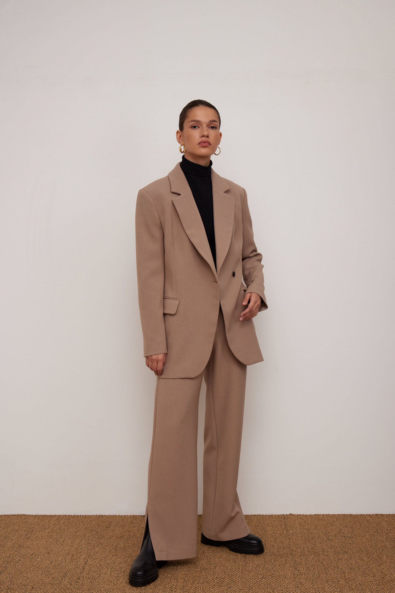 Классические брюки из поливискозы с разрезами по бокам. Модель со средней посадкой. Дополнить образ можно жакетом.