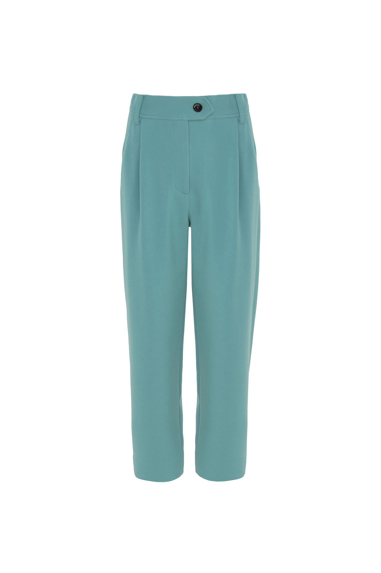 Брюки-бананы прямого кроя с завышенной линией талии, широким поясом и аккуратными защипами, обеспечивающими трендовую посадку и удобство в носке. Для создания костюма сочетайте брюки с соответствующим жакетом.