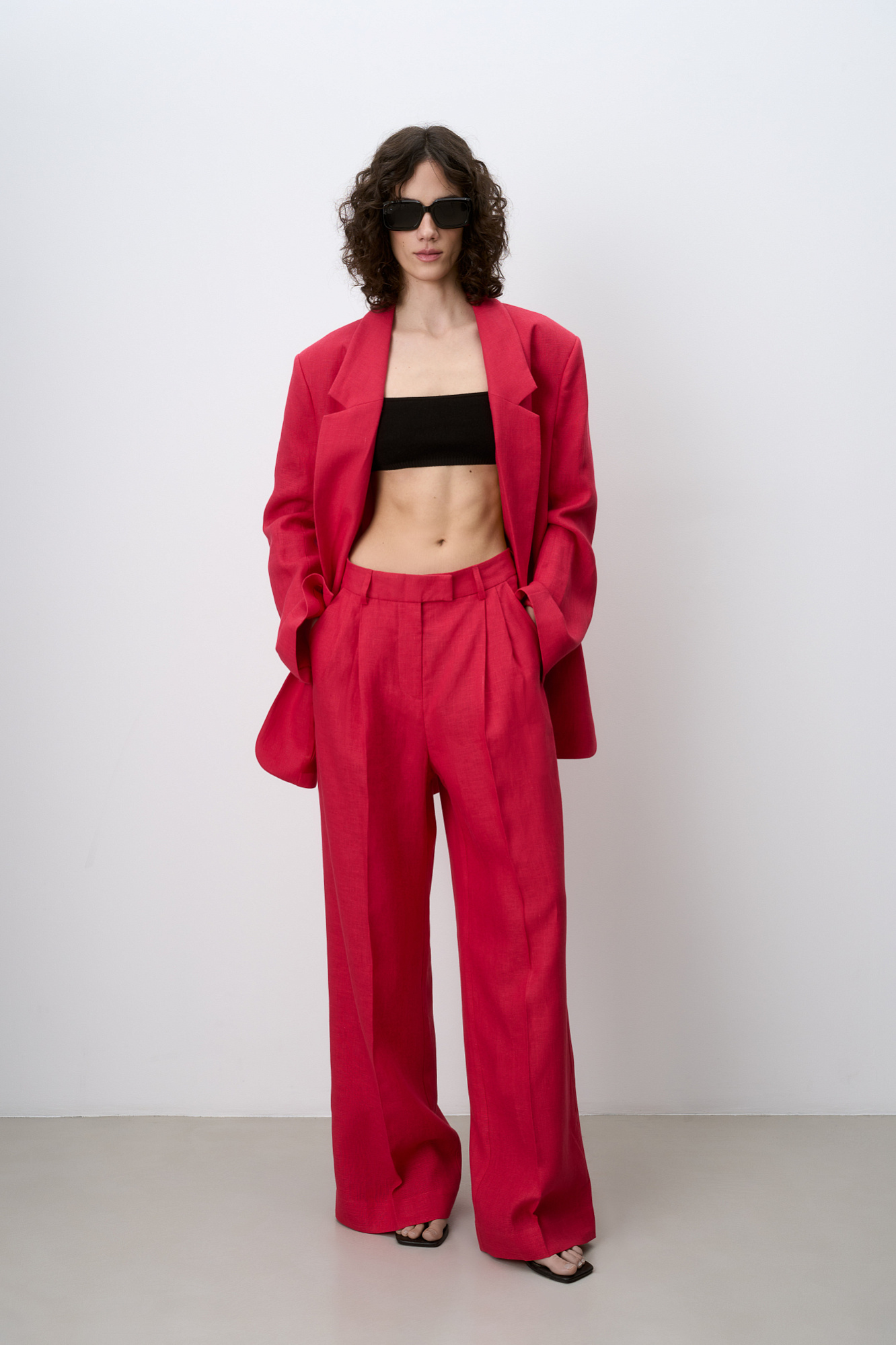 Брюки палаццо выполненные из 100% льна. Модель прямого кроя с защипами на талии, шлевками на поясе для ремня, карманами и застежкой на молнию и скрытый крючок. Дополнить образ можно жакетом.