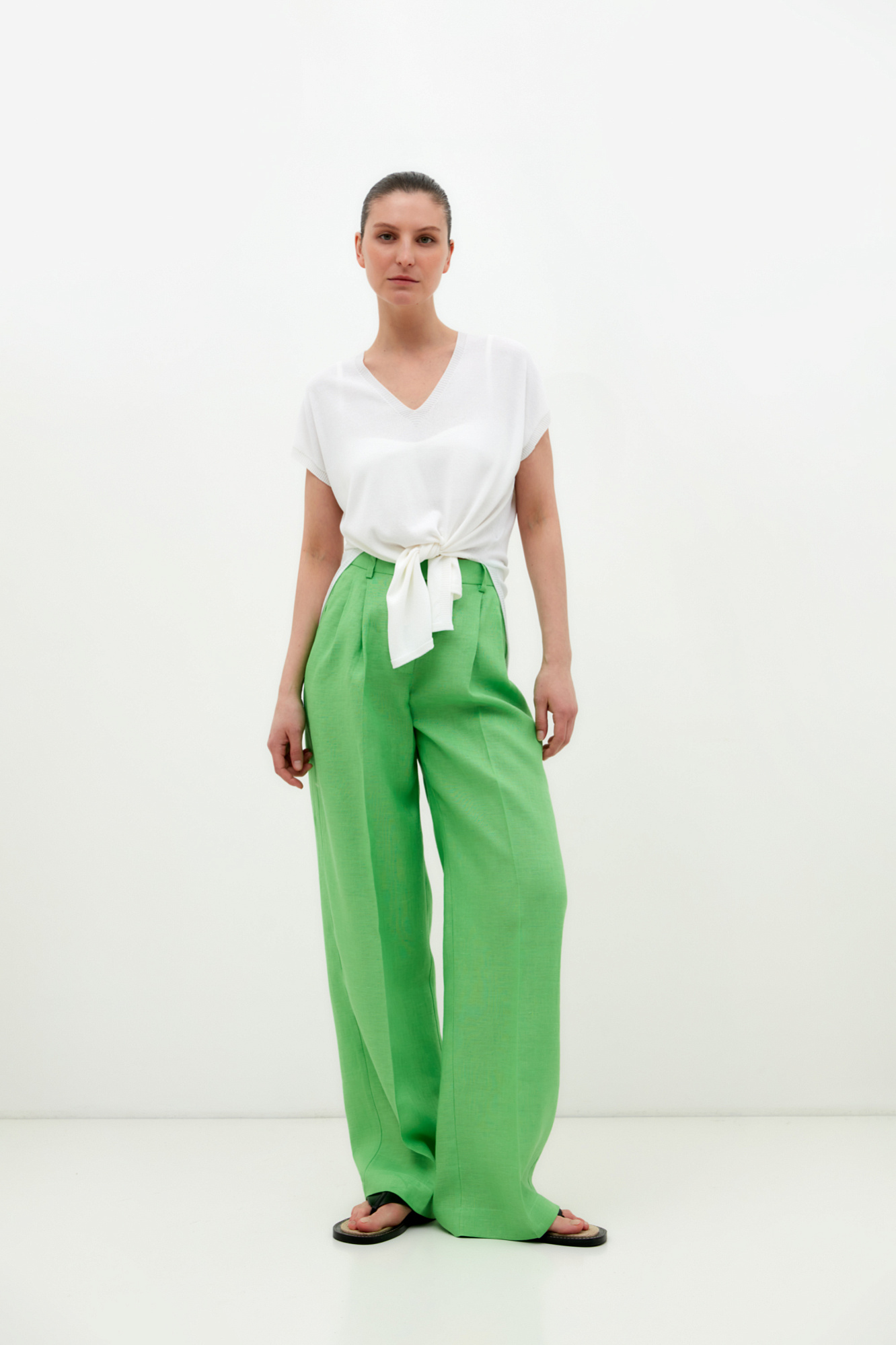 Брюки палаццо выполненные из 100% льна. Модель прямого кроя с защипами на талии, шлевками на поясе для ремня, карманами и застежкой на молнию и скрытый крючок. Дополнить образ можно жакетом.