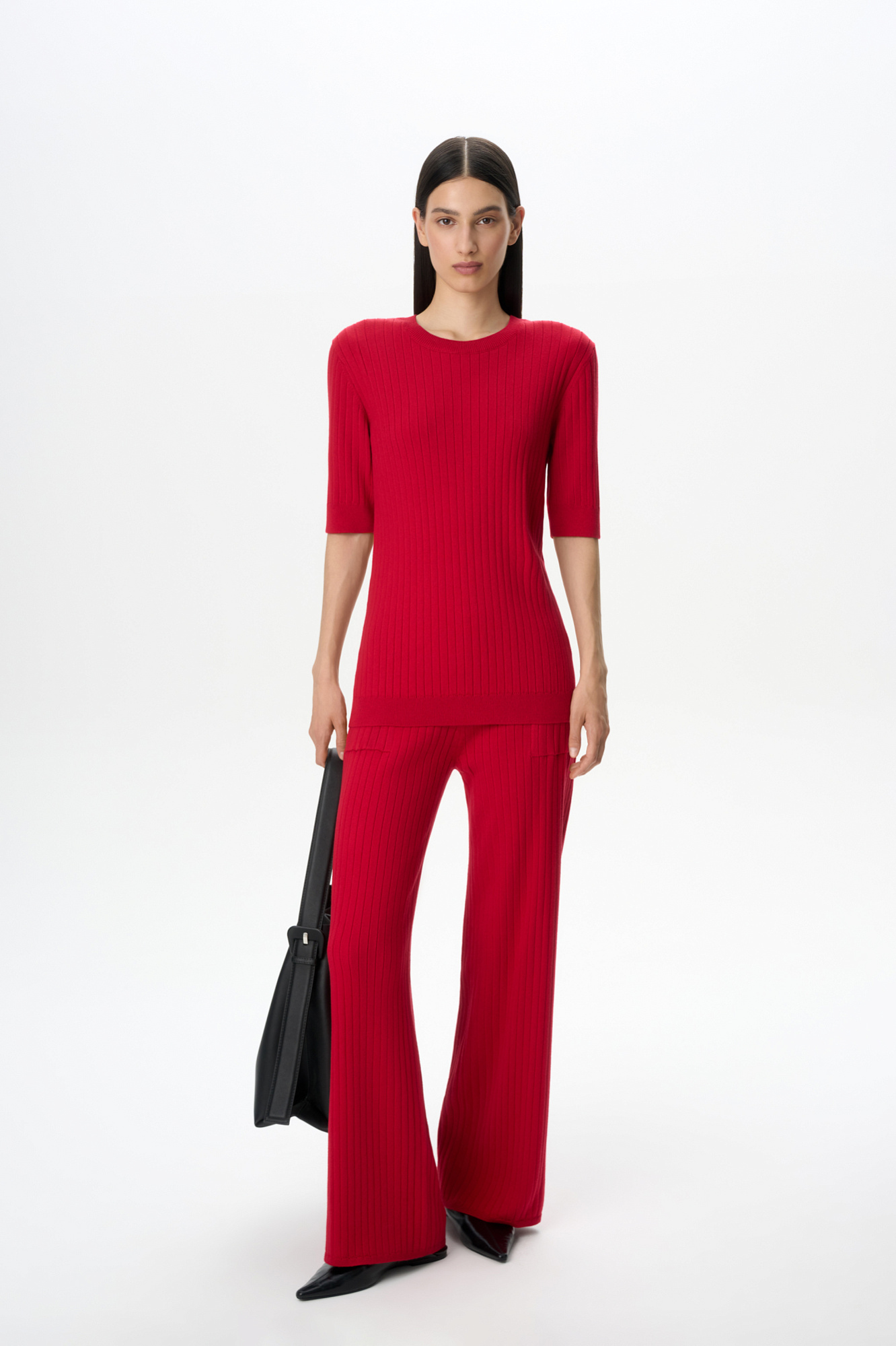 Трикотажный широкие брюки. Модель прямого силуэта с боковыми карманами и эластичным поясом в рубчик. Дополнить образ можно футболкой в таком же стиле.
