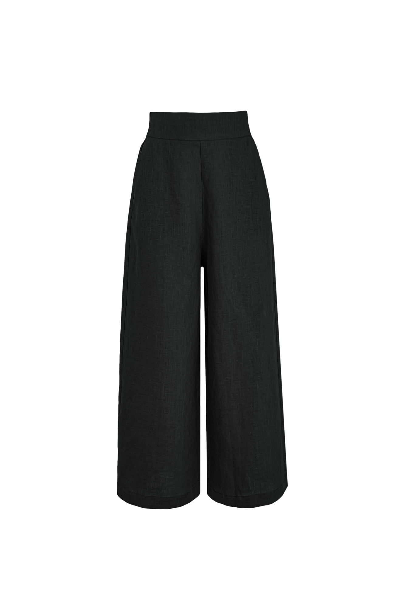 Льняные брюки-кюлоты с высокой посадкой и карманами сбоку, пояс на резинке