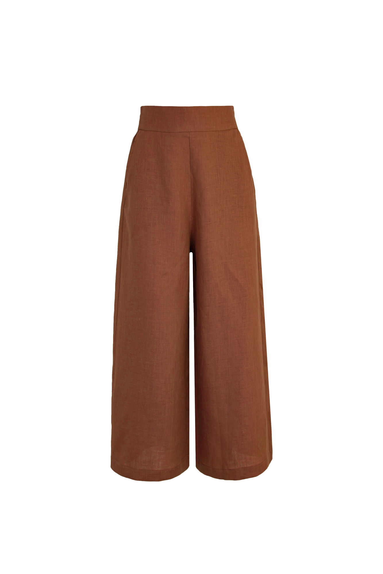 Льняные брюки-кюлоты с высокой посадкой и карманами сбоку, пояс на резинке