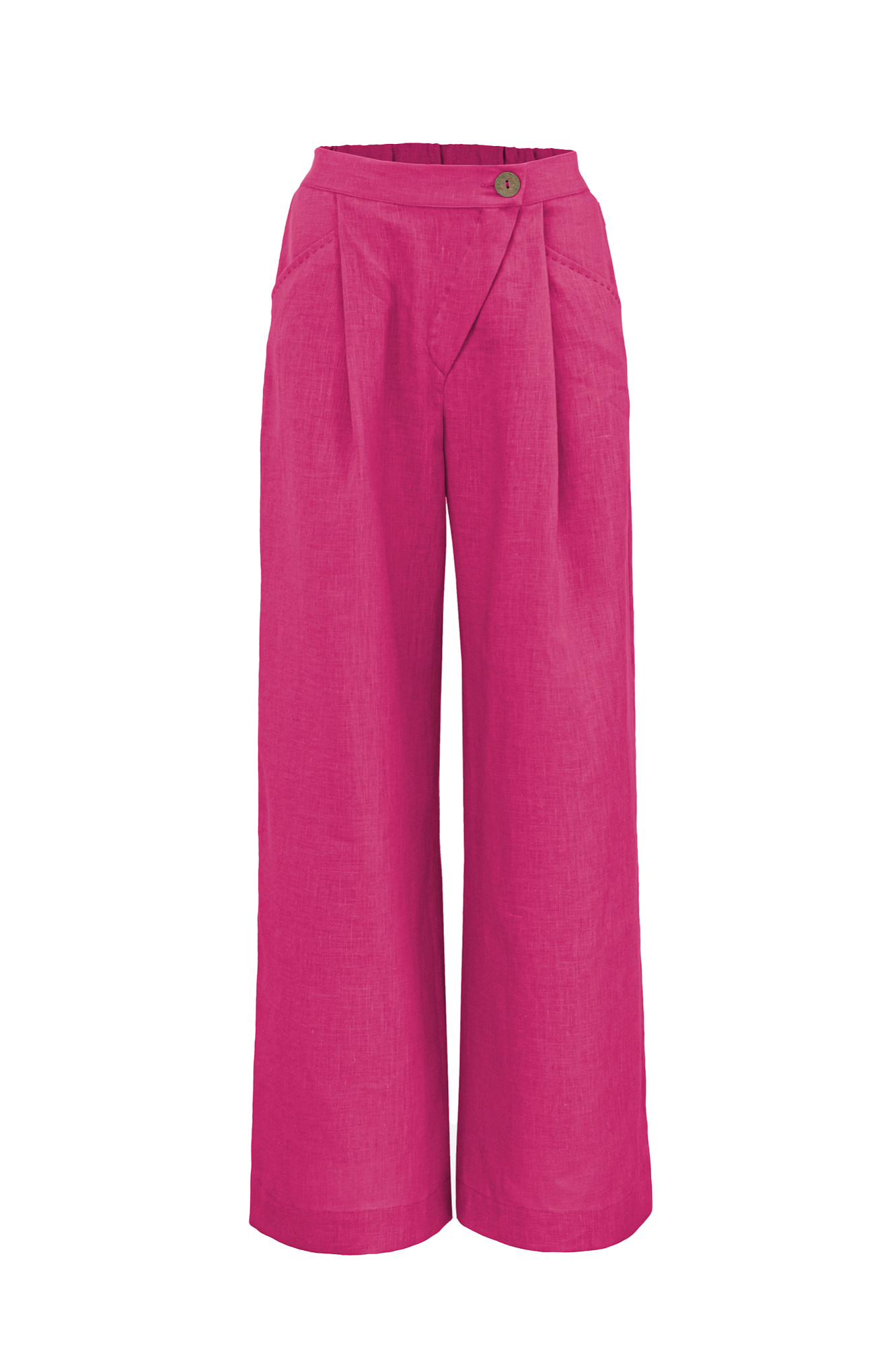 Брюки из 100% льна. Модель прямого кроя, с высокой посадкой, косой застежкой на пуговицу и молнию, боковыми карманами.