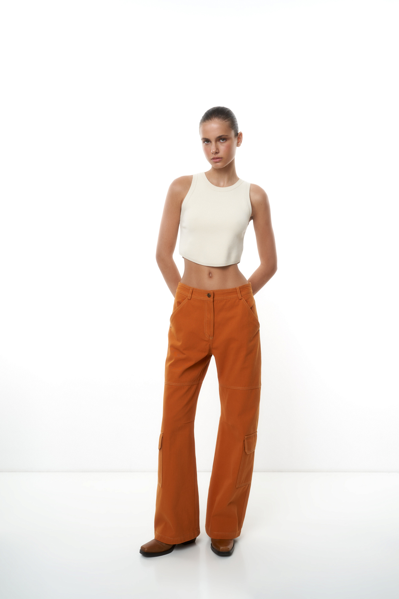 Джинсовые брюки карго со средней посадкой. Застежка на молнию и пуговицу. Шесть карманов: четыре стандартных и два дополнительных снизу.