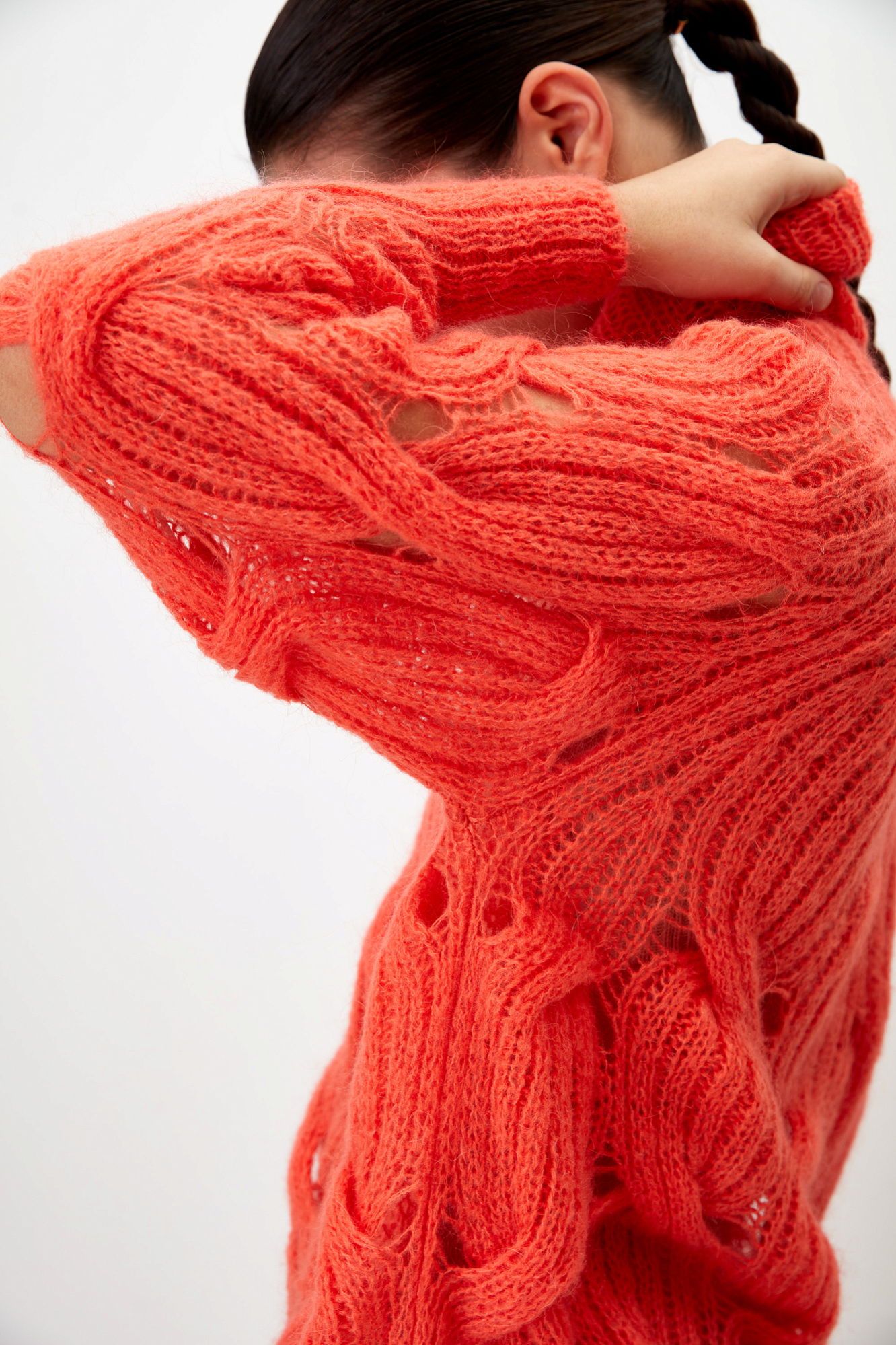 Объемный удлиненный джемпер с мохером, вязка выполнена крупными косами. Высокий ворот под горло. Манжеты рукавов и низ изделия на резинке.