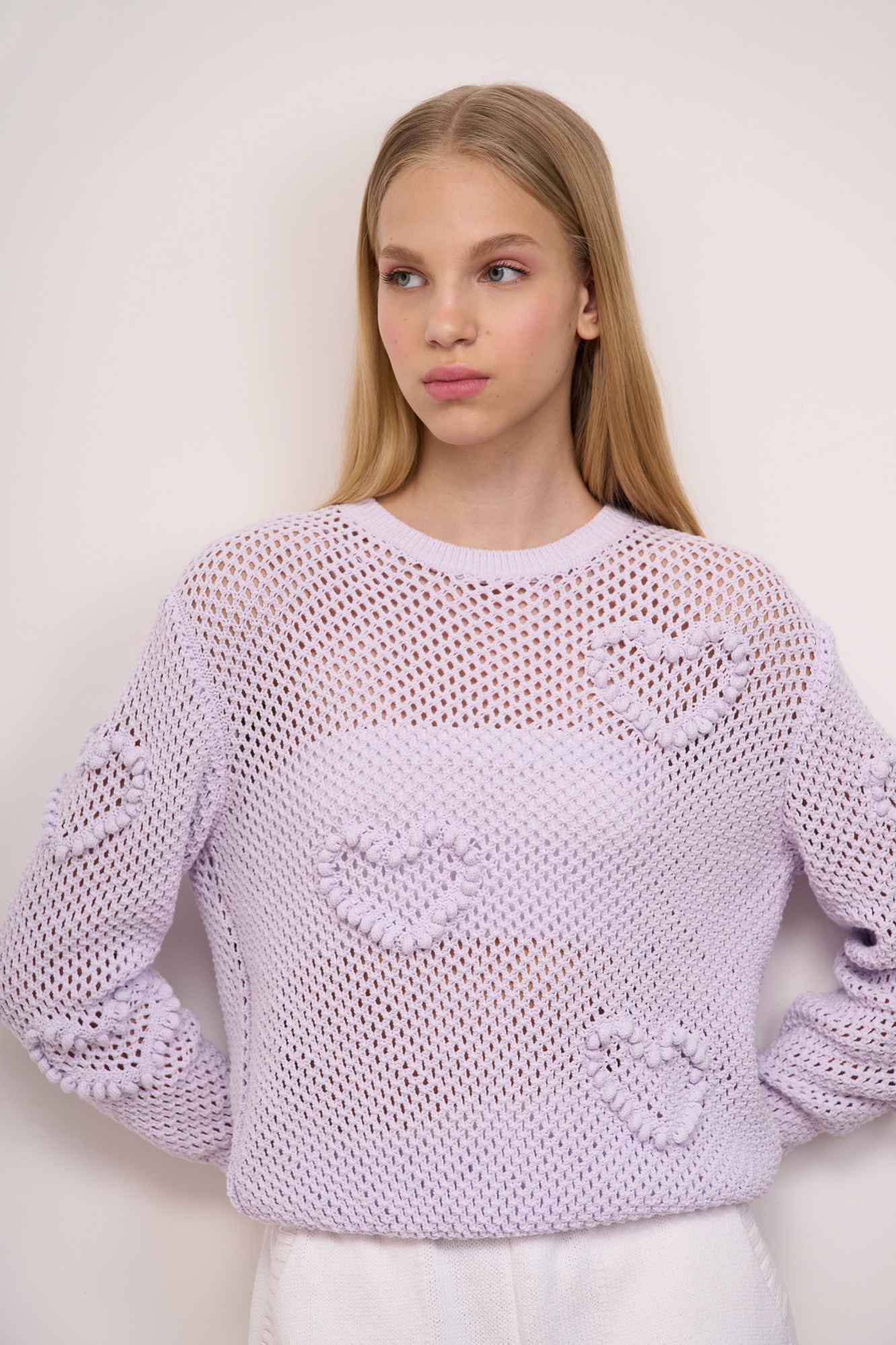 Свободный джемпер из хлопка в сетку. Фактурные сердечки. Круглый вырез. Регулируемые манжеты, внизу широкая резинка.