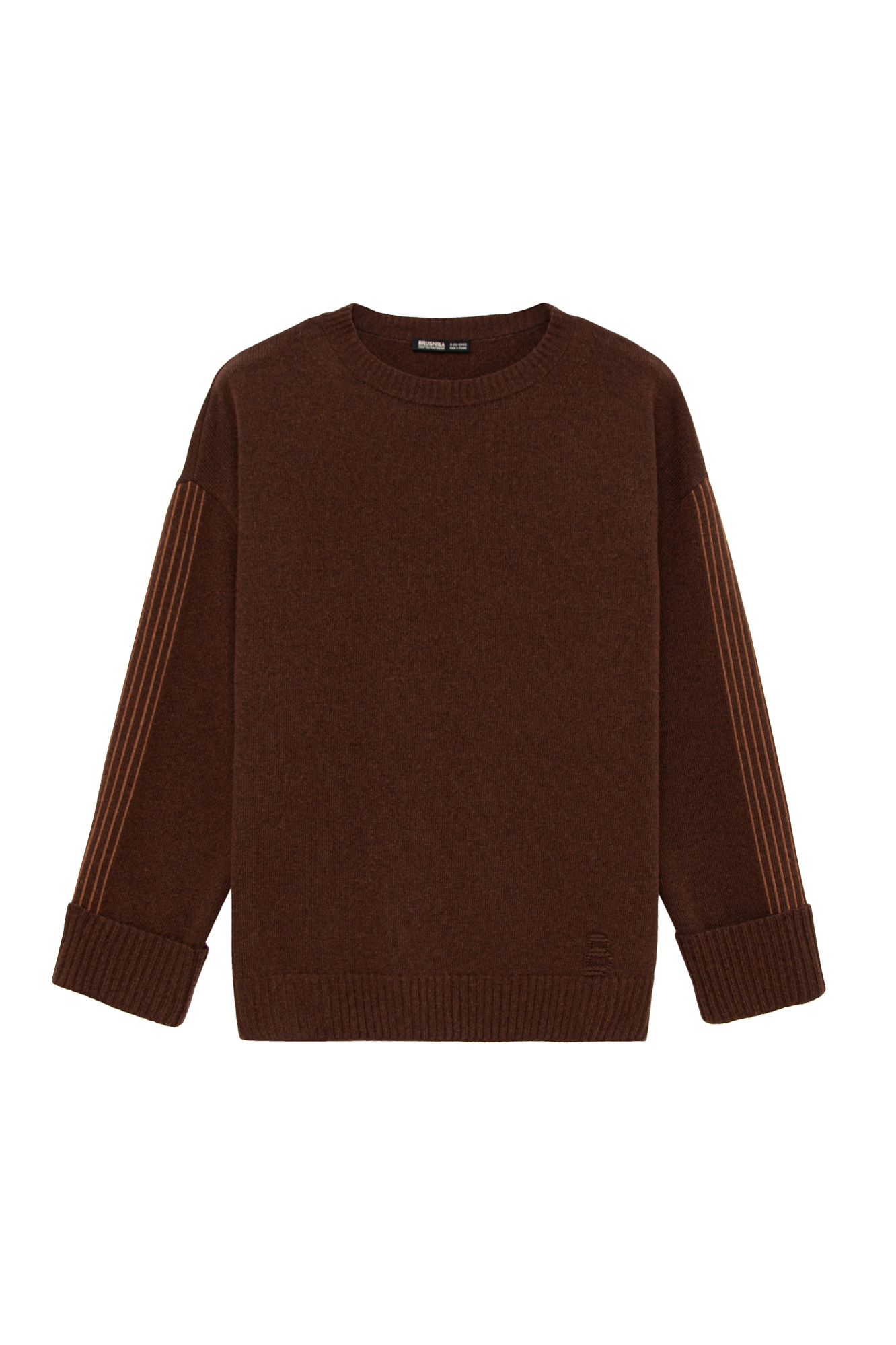 Трикотажный джемпер из шерсти с добавлением кашемира. Модель свободного силуэта со спущенной линией плеча и контрастными полосами на рукавах.