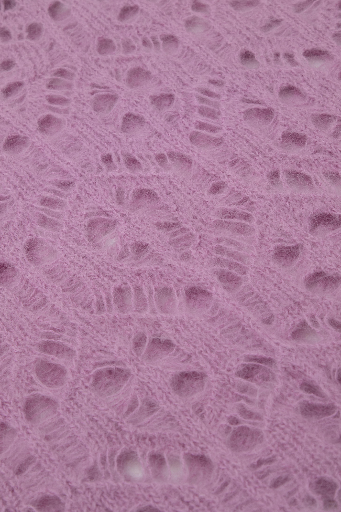 Трикотажный джемпер из мохера с добавлением шерсти. Модель свободного силуэта со спущенным плечом выполненная ажурным переплетением. Края изделия в рубчик.