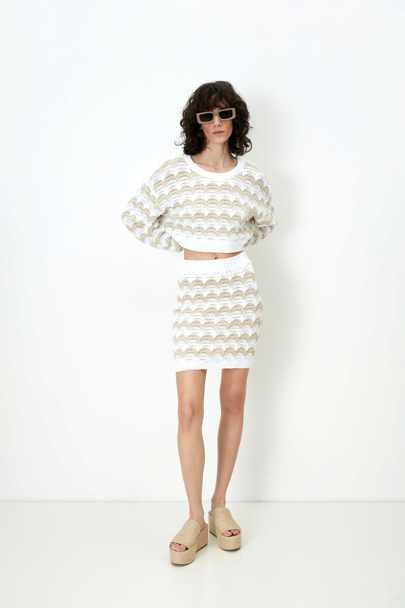 Трикотажный джемпер из хлопка с волнистым узором. Манжеты и низ изделия из эластичной ленты в рубчик.