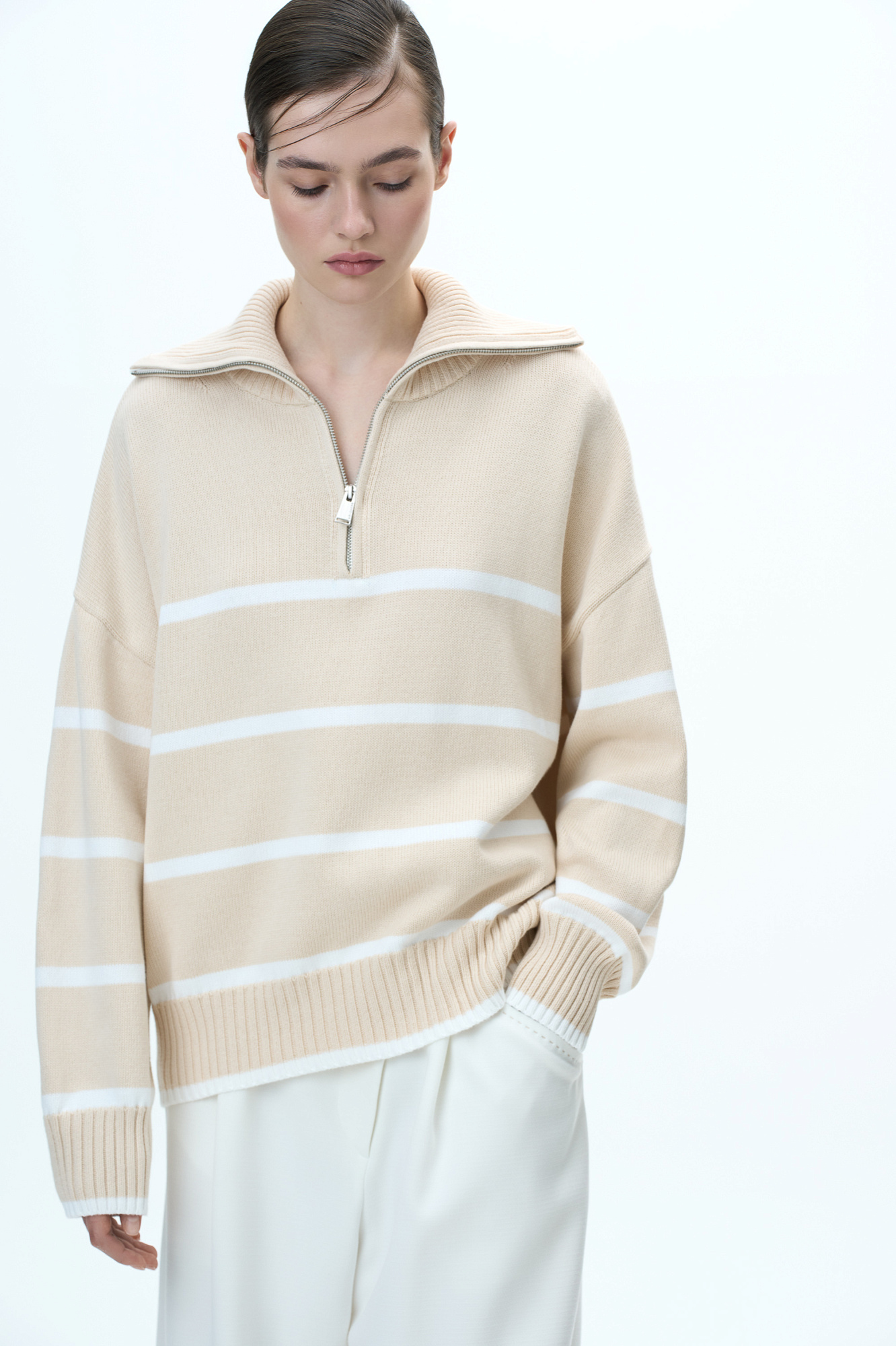 Трикотажный джемпер из 100% хлопка в полоску. Модель свободного силуэта со спущенной линией плеча и воротником-стойкой на молнии.