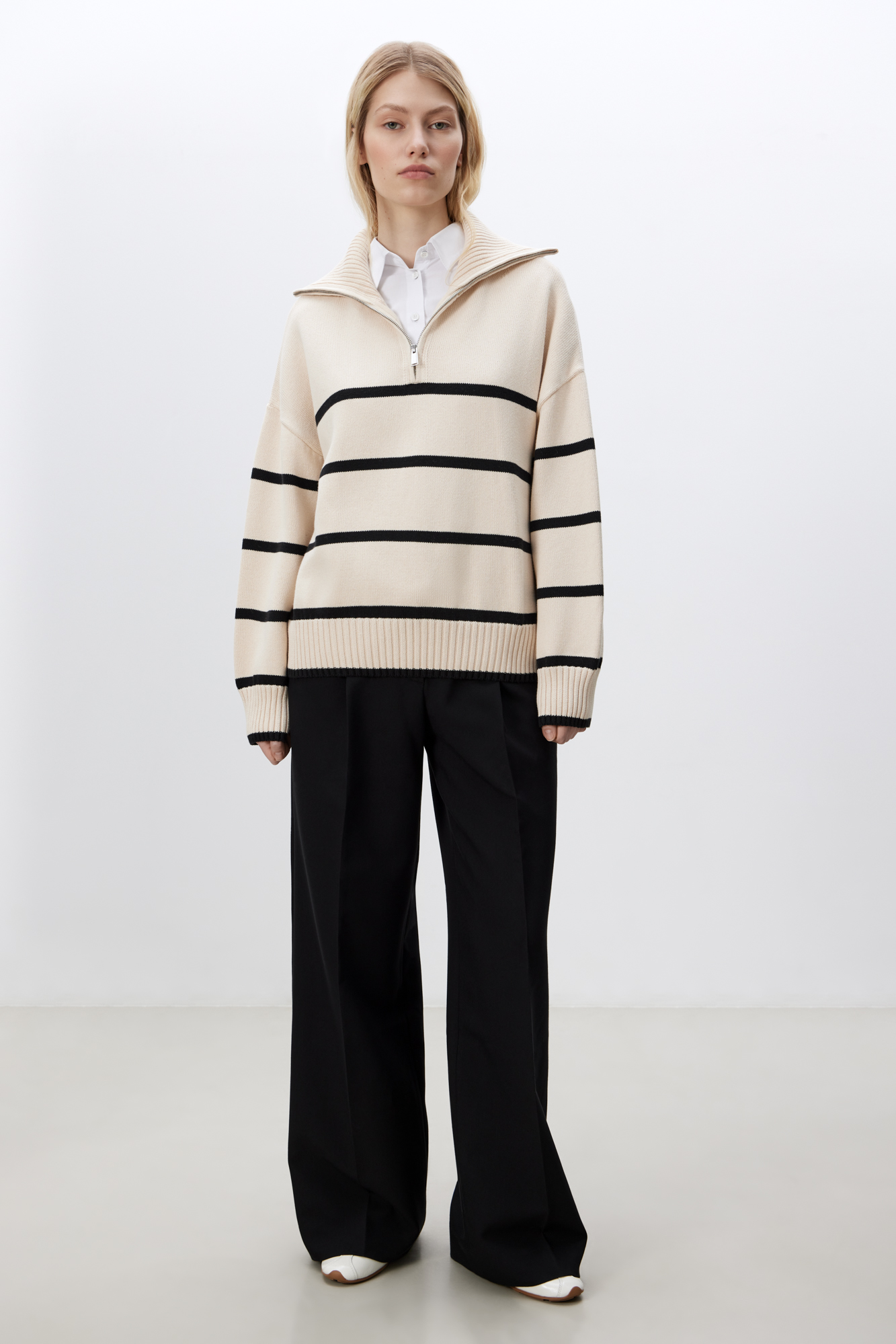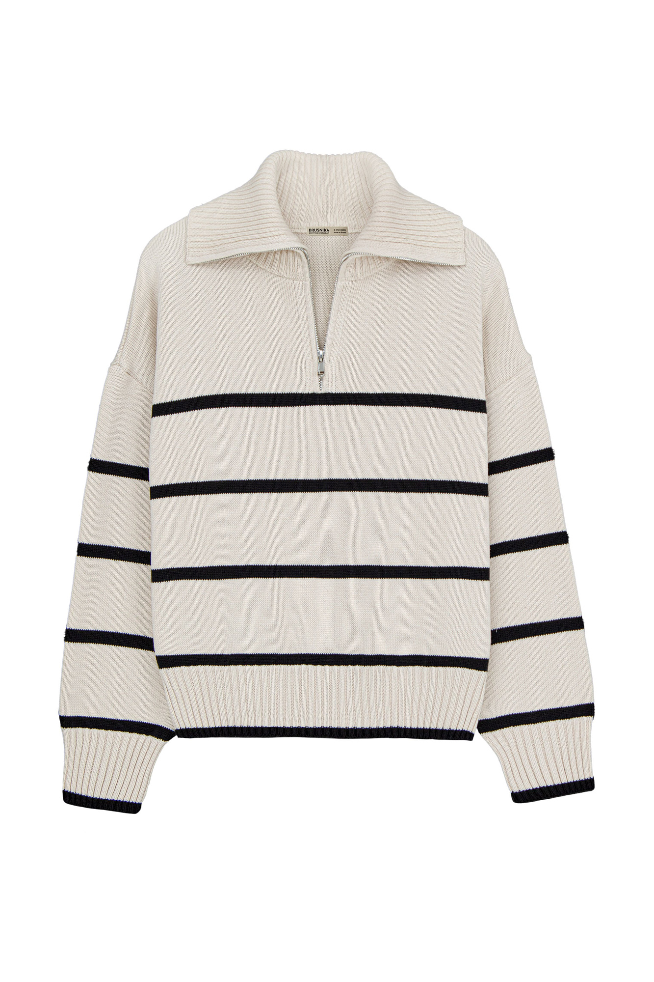 Трикотажный джемпер из 100% хлопка в полоску. Модель свободного силуэта со спущенной линией плеча и воротником-стойкой на молнии.