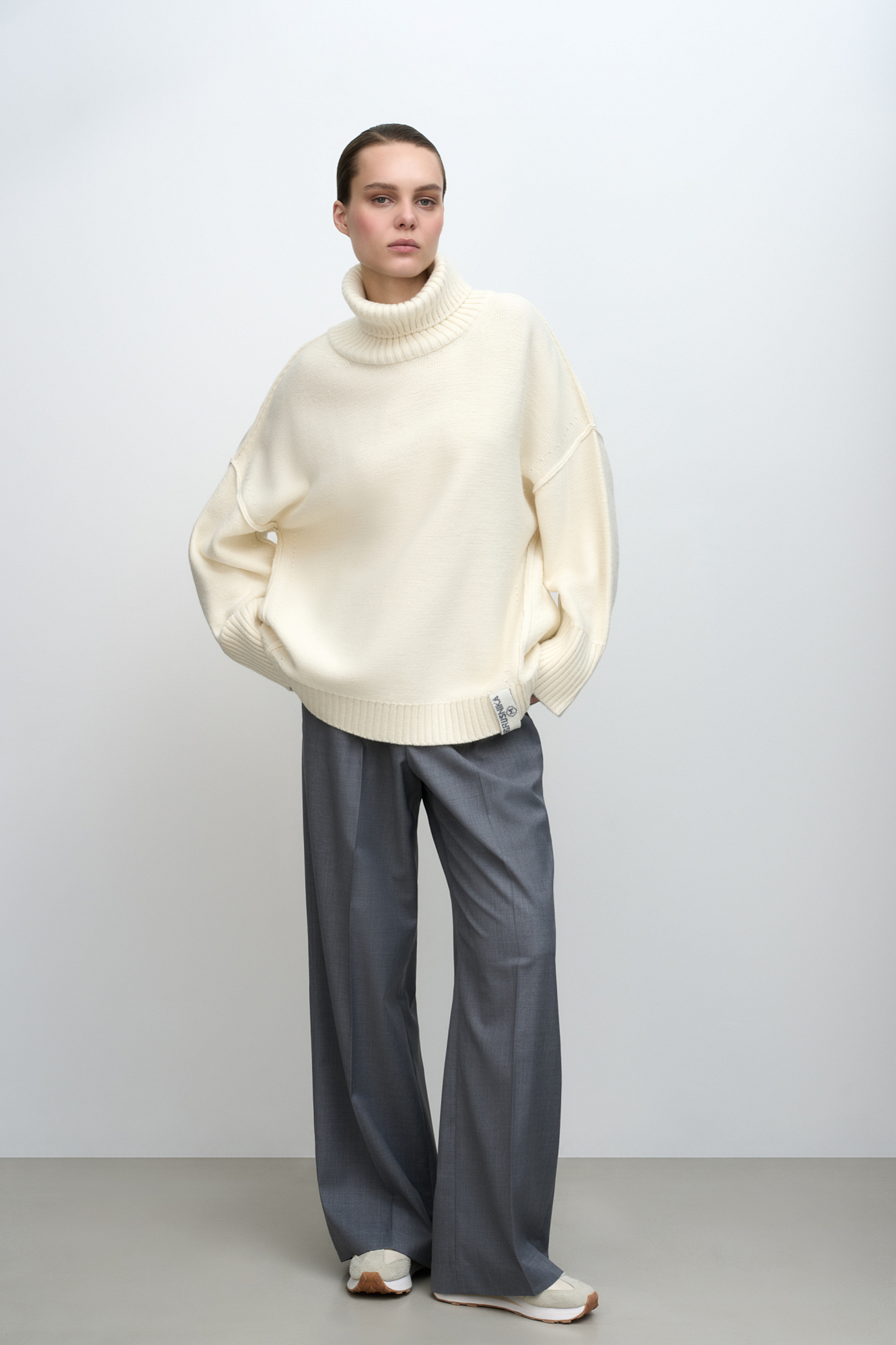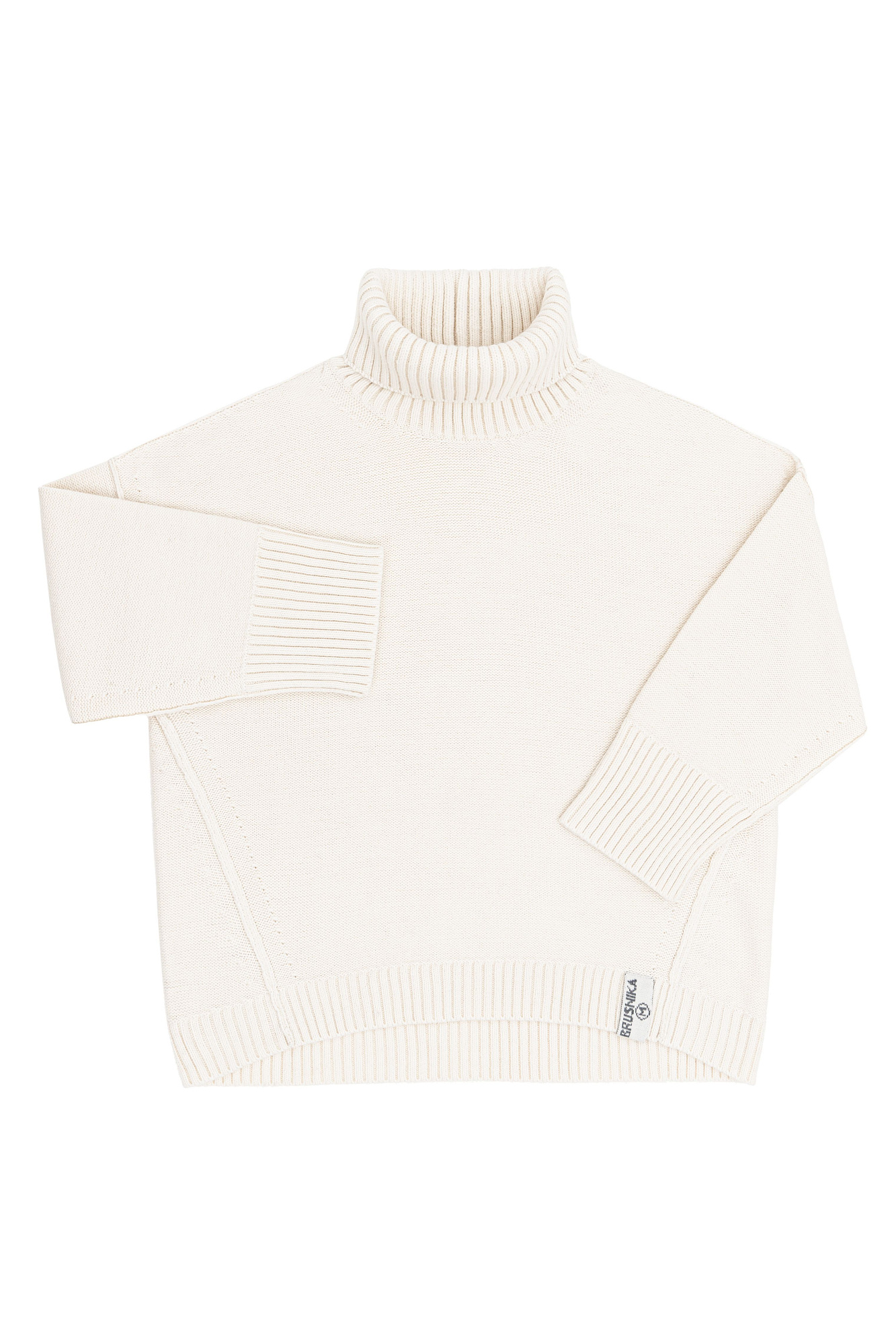 Джемпер из шерсти альпака. Модель свободного силуэта с высокоим воротом и спущенным плечом, швы проймы сделаны на лицевую сторону.