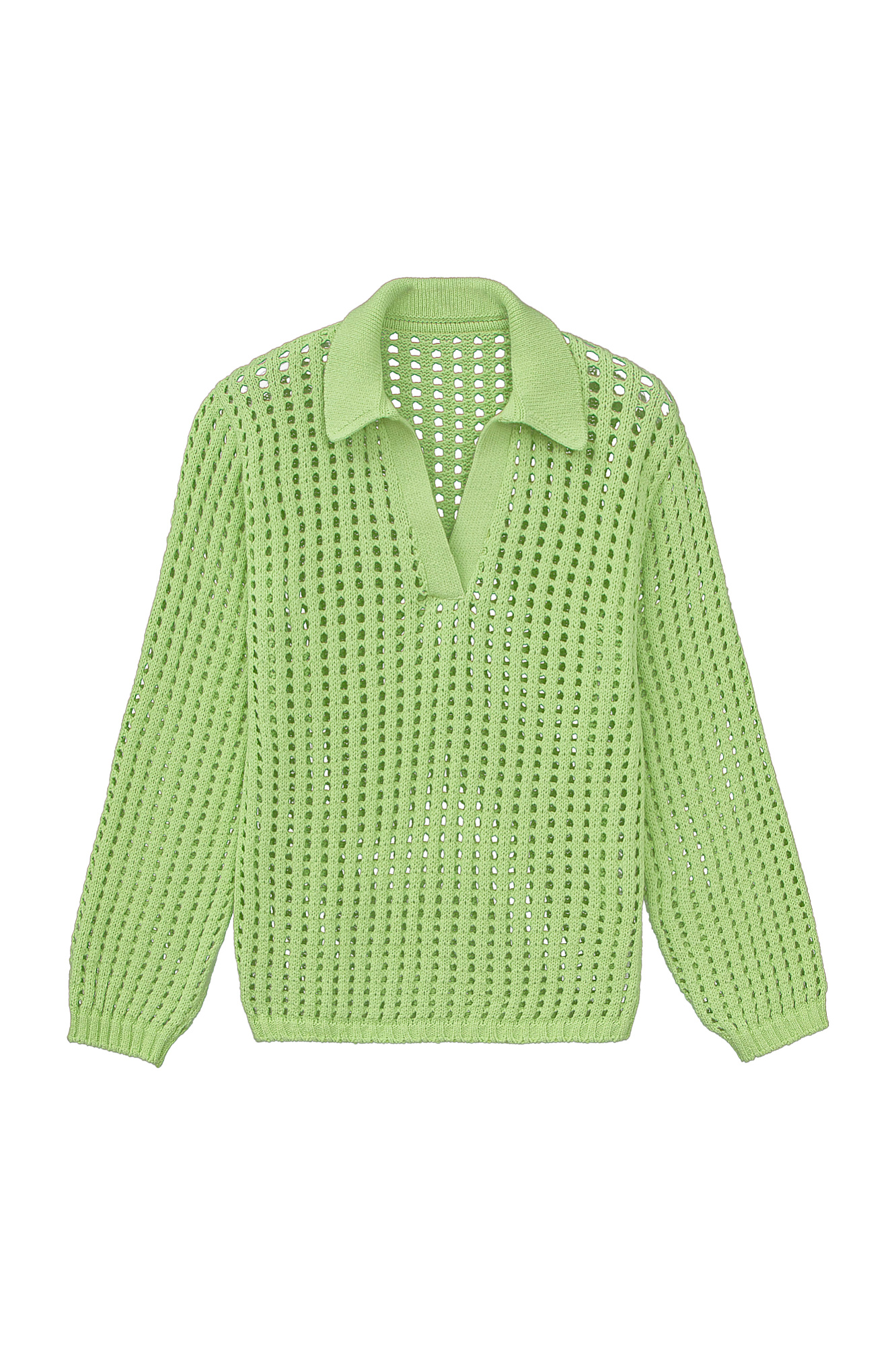 Джемпер в сетку из 100% хлопка с V-образным вырезом и воротником-поло. Длинные рукава на манжетах, узкая резинка в рубчик по низу.