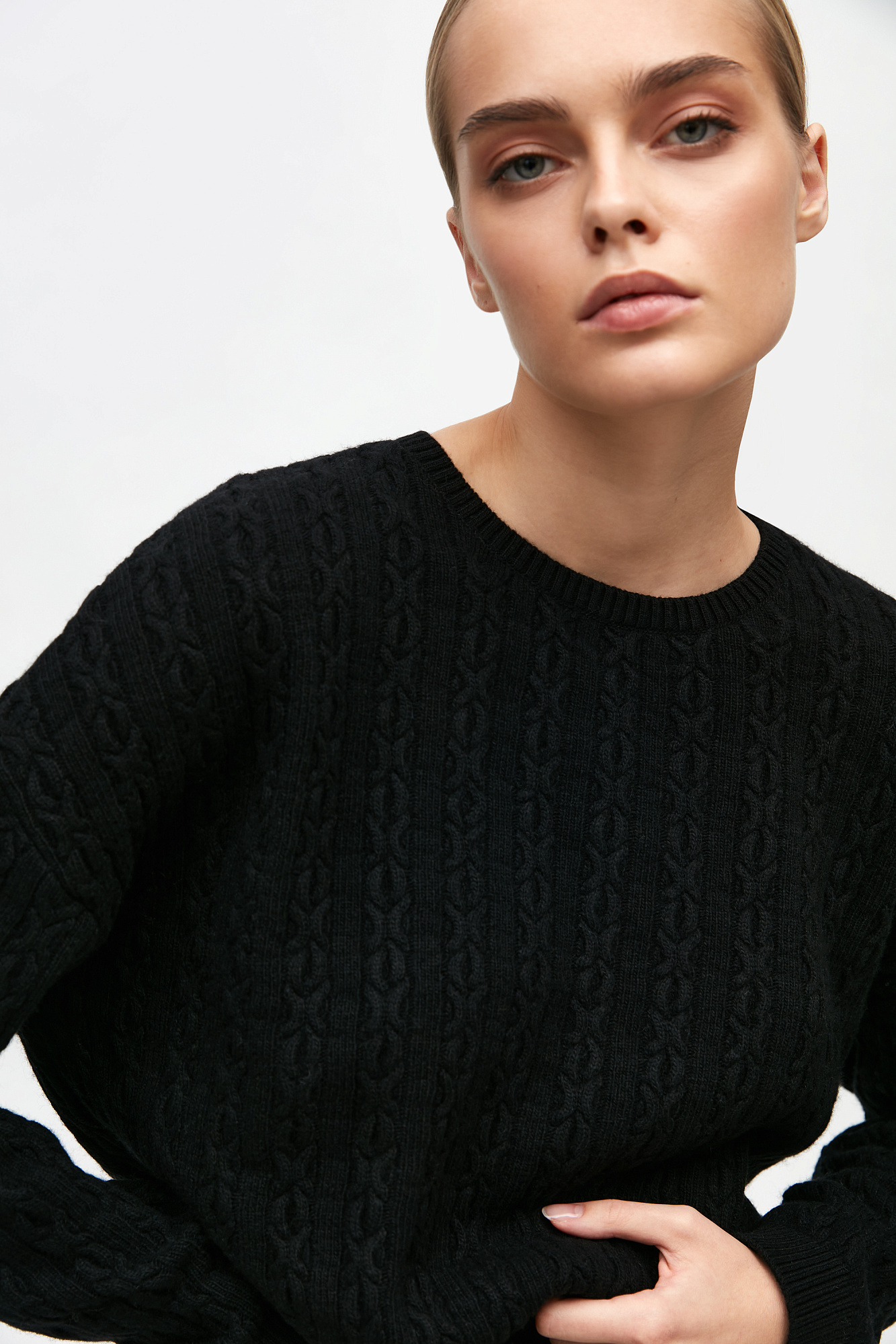 Трикотажный джемпер из смесовой шерсти с добавлением кашемира. Модель прямого кроя со спущенной линией плеч и круглым вырезом горловины. Изделие декорировано вывязанными косами. Края выполнены в рубчик.