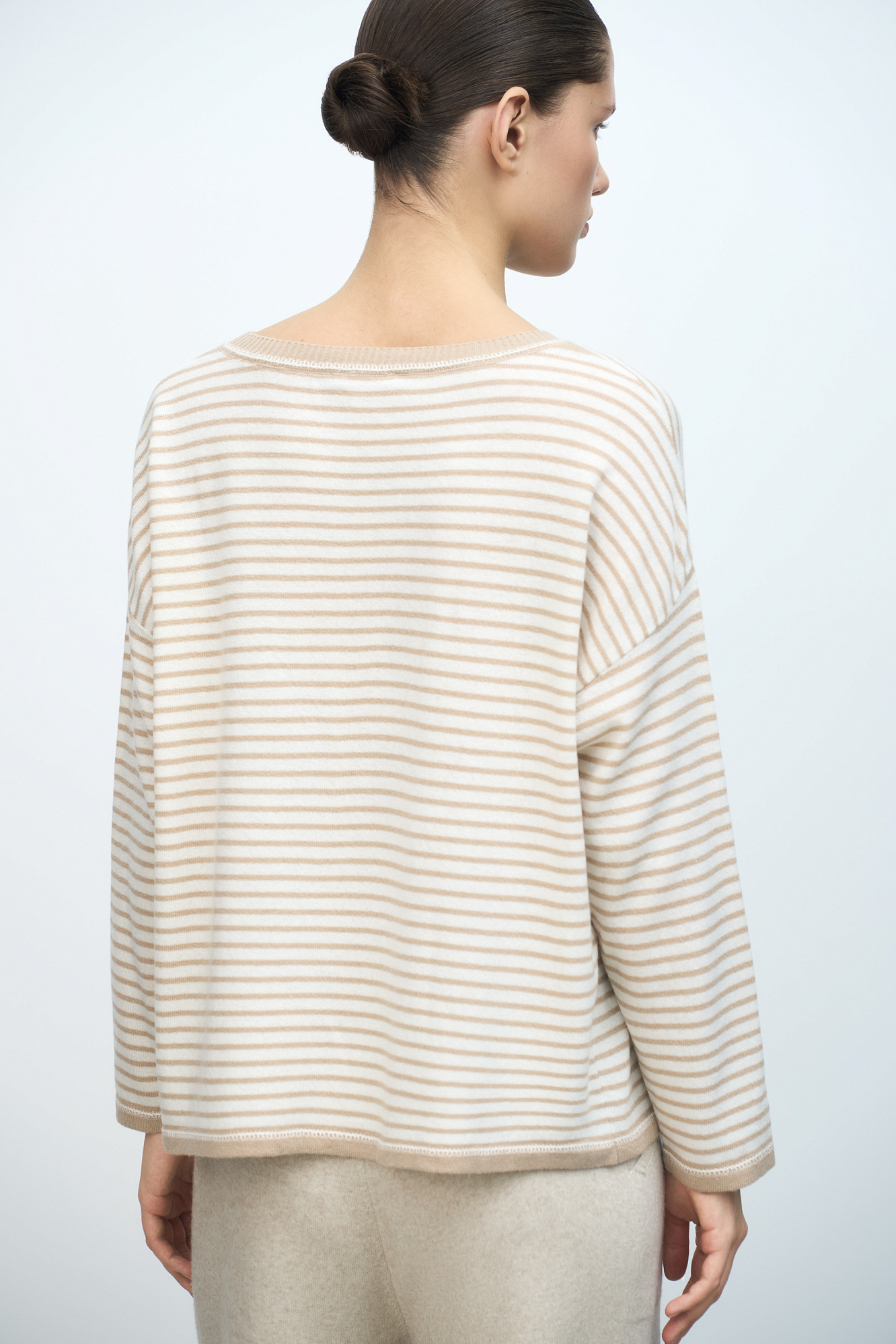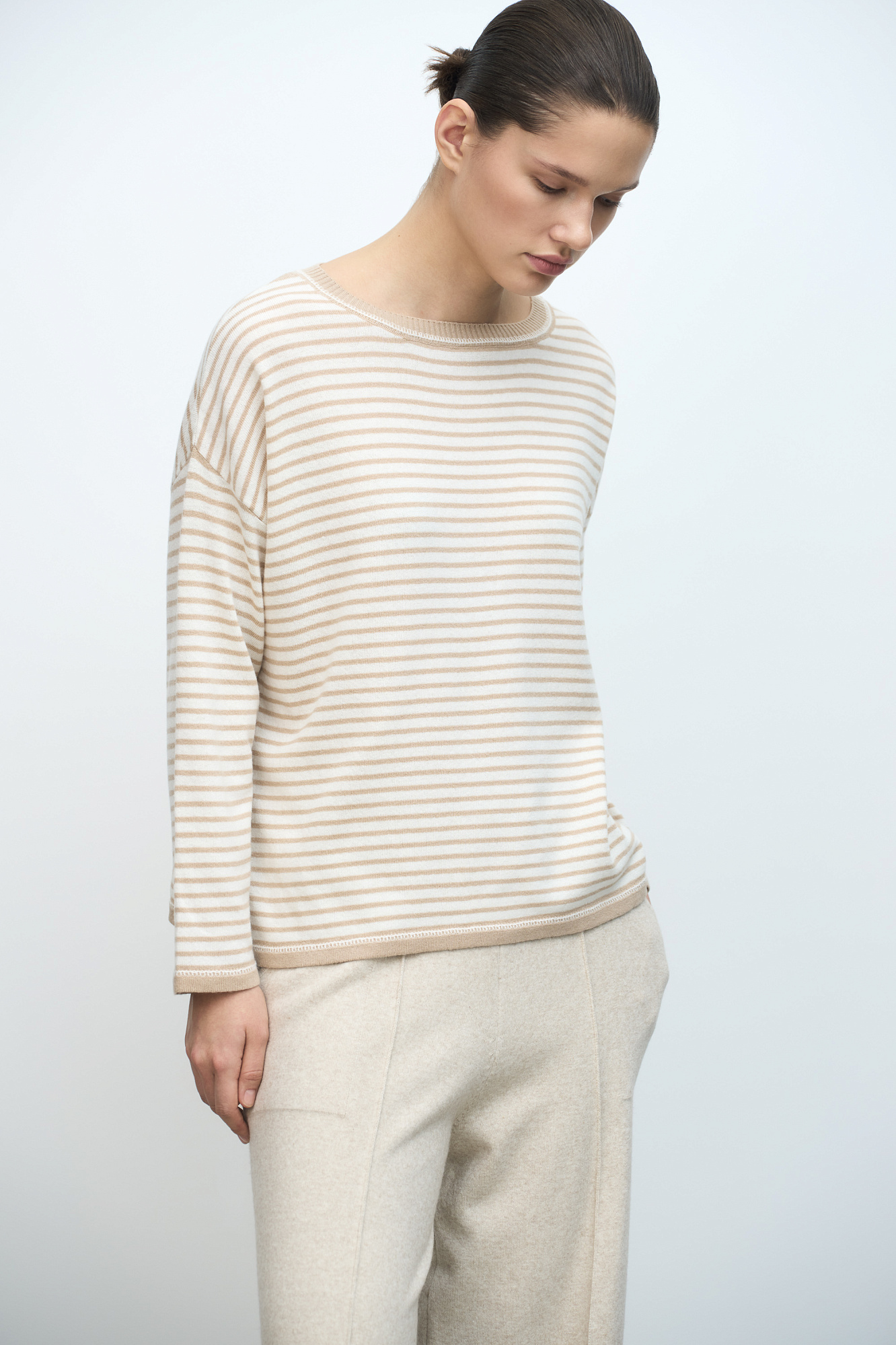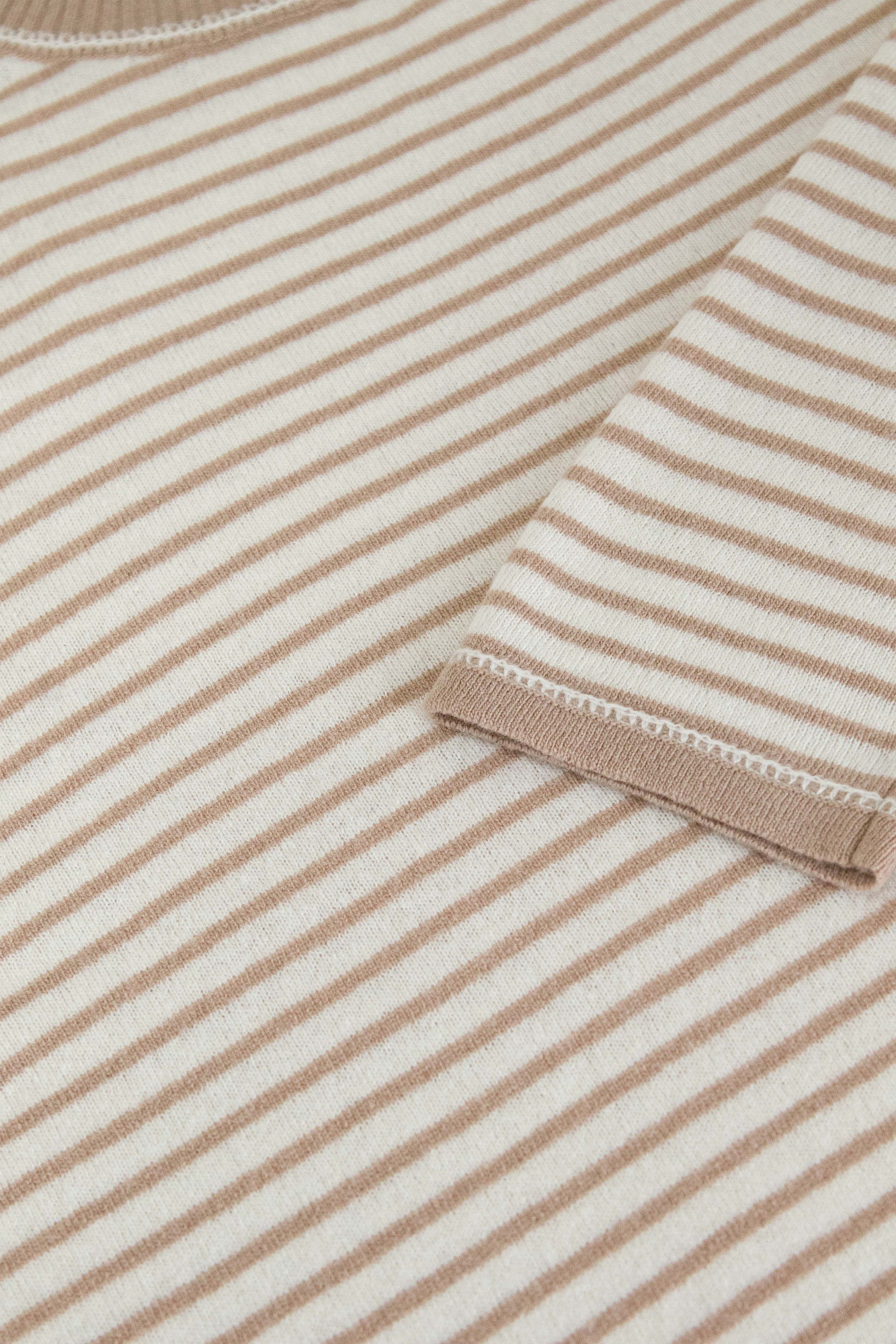 Трикотажный джемпер в полоску из шерсти с добавлением кашемира. Модель свободного силуэта со спущенной линией плеч и круглым вырезом горловины.
