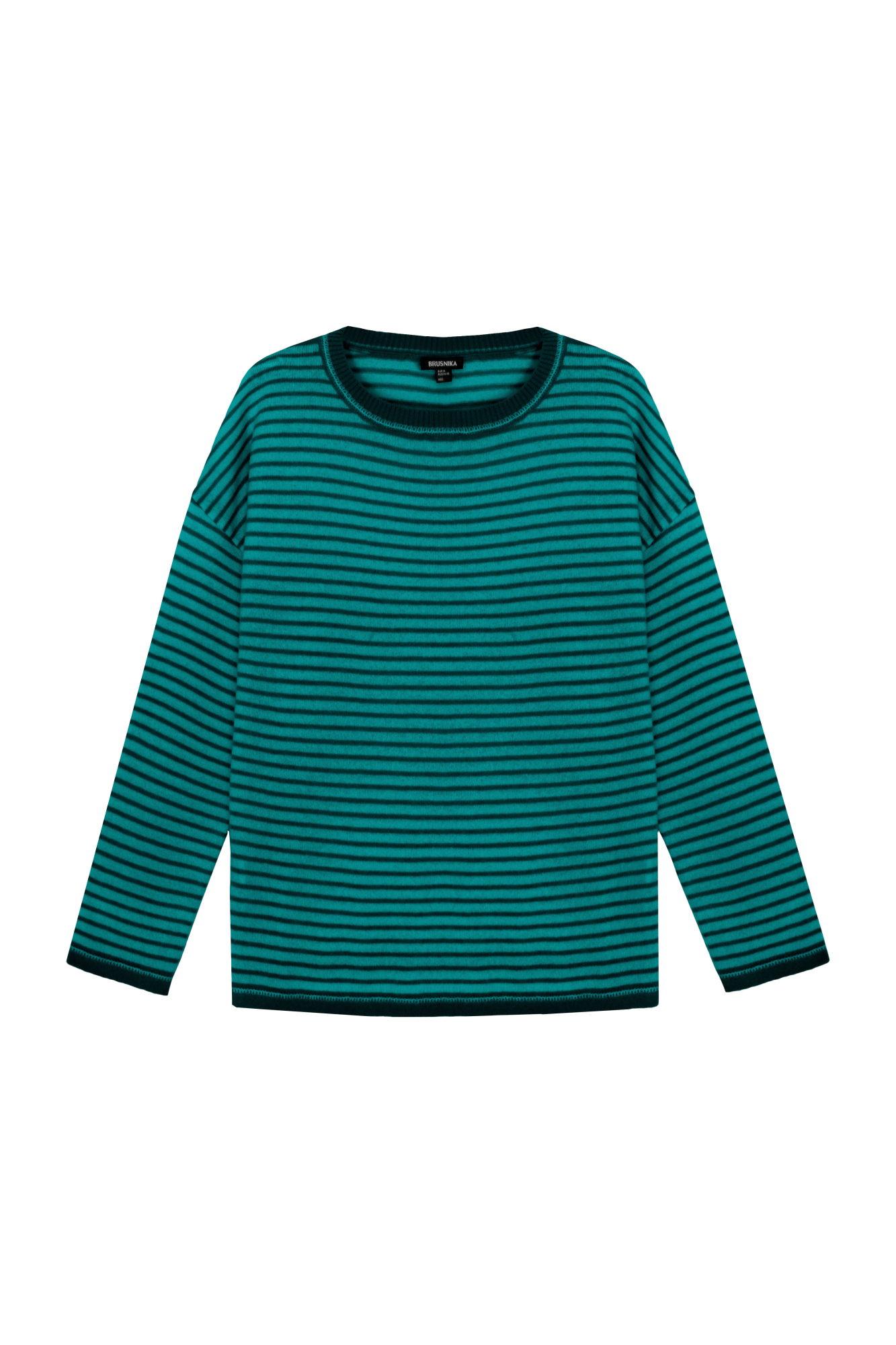 Трикотажный джемпер в полоску из шерсти с добавлением кашемира. Модель свободного силуэта со спущенной линией плеч и круглым вырезом горловины.