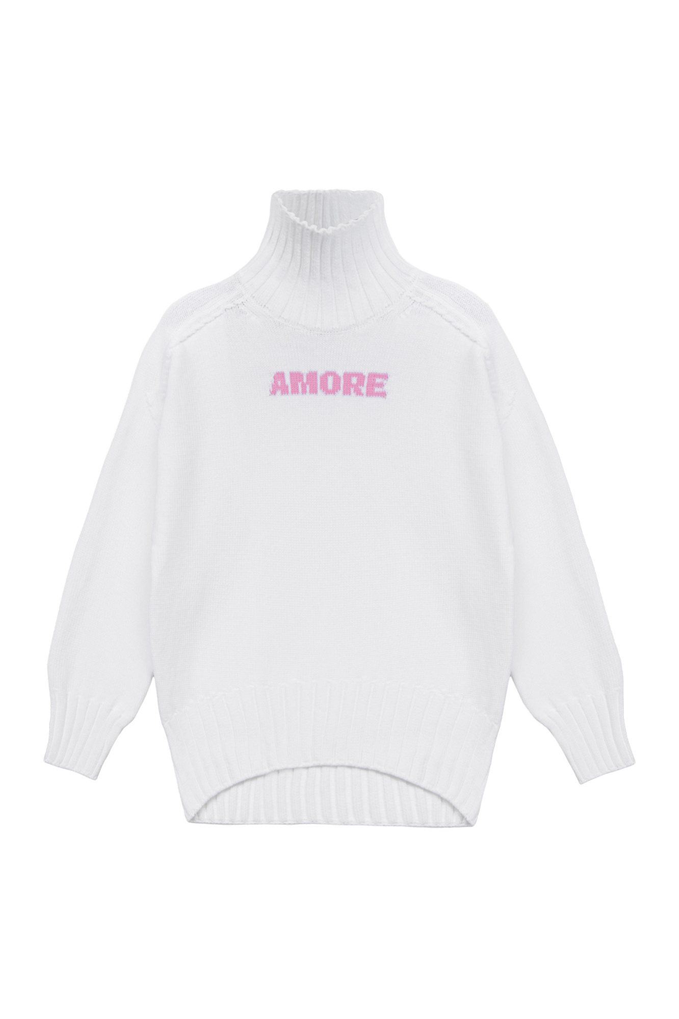 Трикотажный джемпер из 100% хлопка. Модель свободного силуэта со спущенной линией плеч, высоким воротом и вывязанной надписью "Amore" на груди.