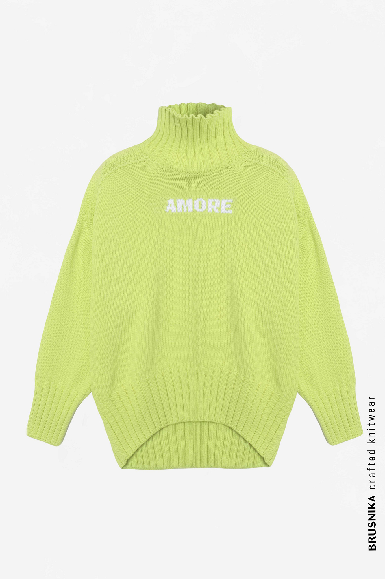 Трикотажный джемпер из 100% хлопка. Модель свободного силуэта со спущенной линией плеч, высоким воротом и вывязанной надписью "Amore" на груди.