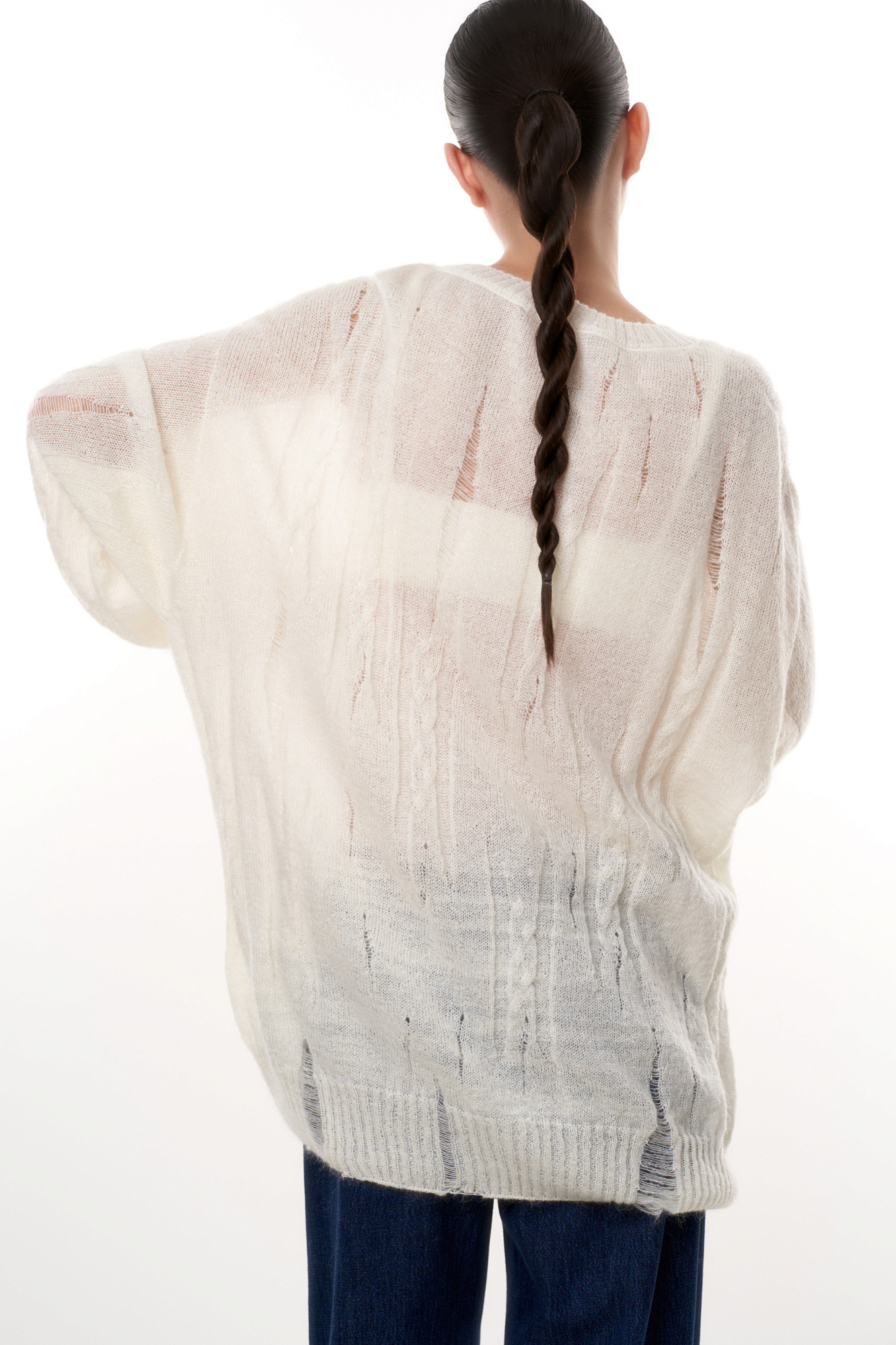 Трикотажный джемпер из смесовой шерсти. Модель свободного силуэта со спущенной линией плеча и разрезами в стиле гранж.
