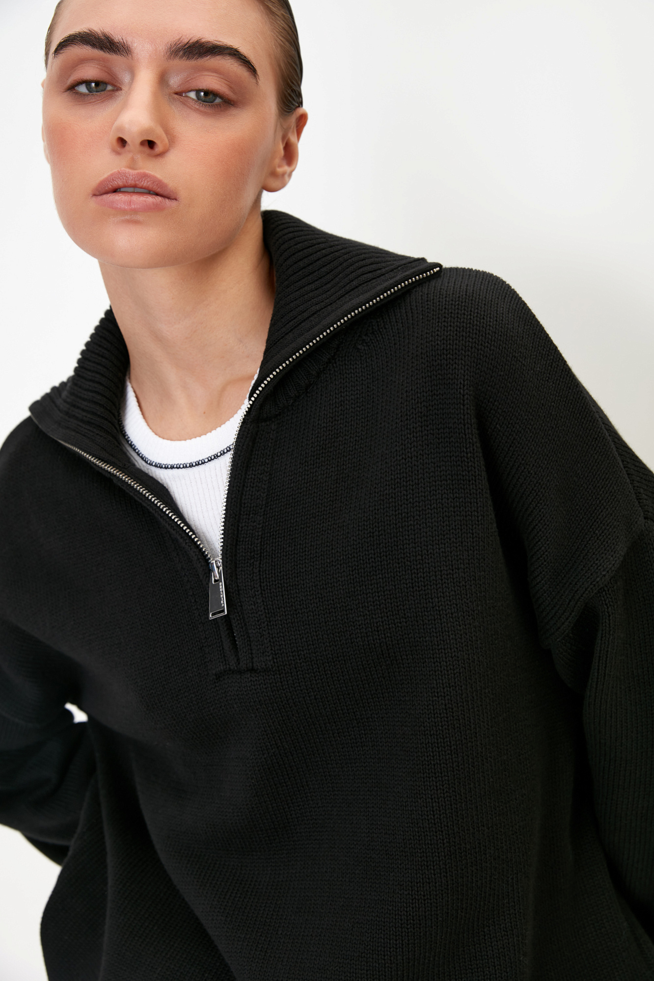 Джемпер из 100% хлопка с воротником-стойкой. Застежка на молнии, манжеты и низ изделия из эластичной ленты в рубчик.