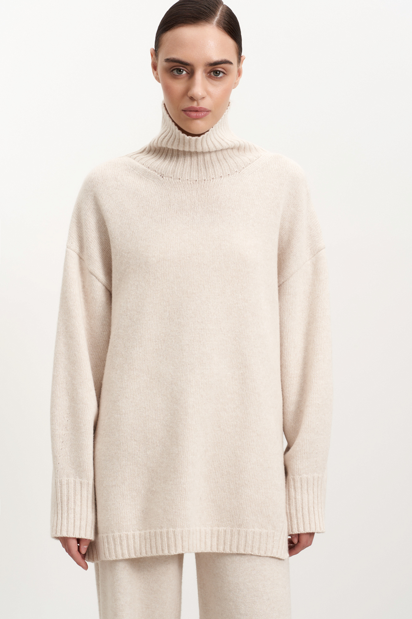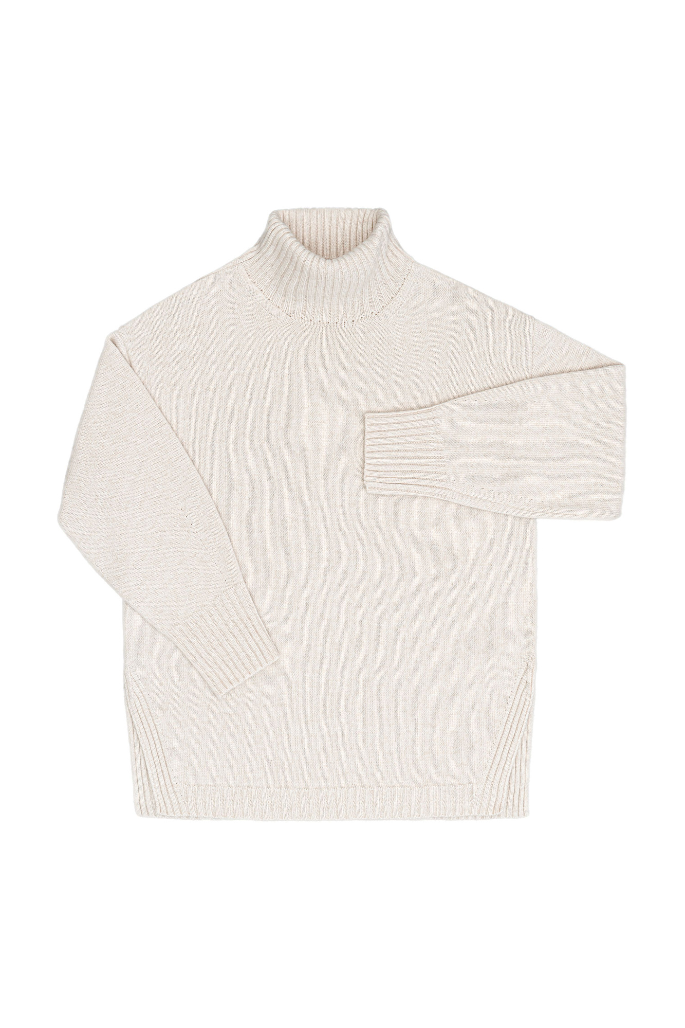 Джемпер свободного силуэта из кашемира и шерсти с высоким воротом и с боковыми разрезами.