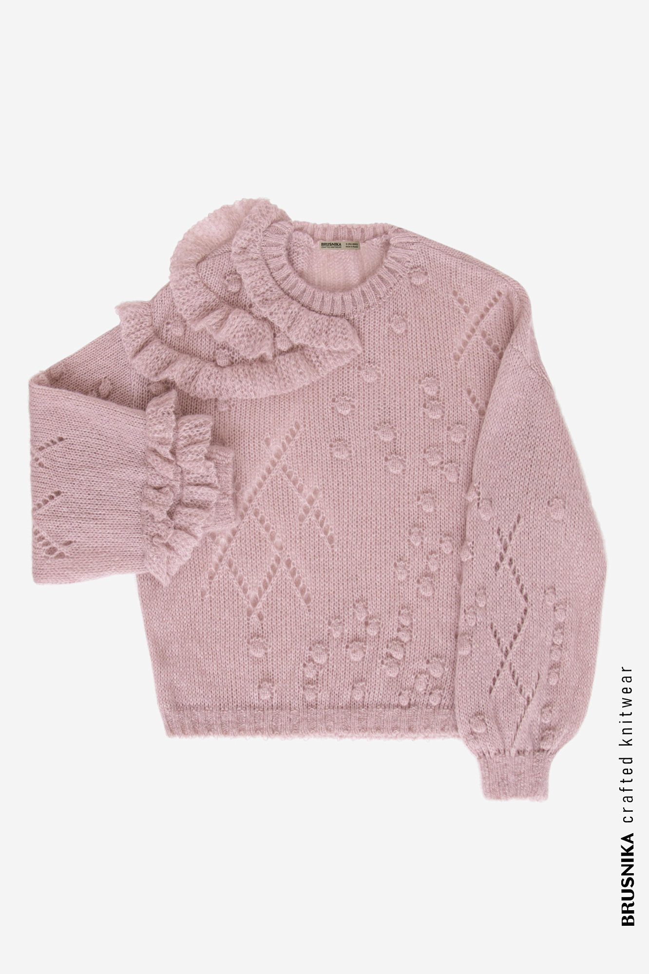 Трикотажный ажурный джемпер из смесовой шерсти с добавлением мохера. Джемпер декорирован вывязанными рюшами на плече и манжете.