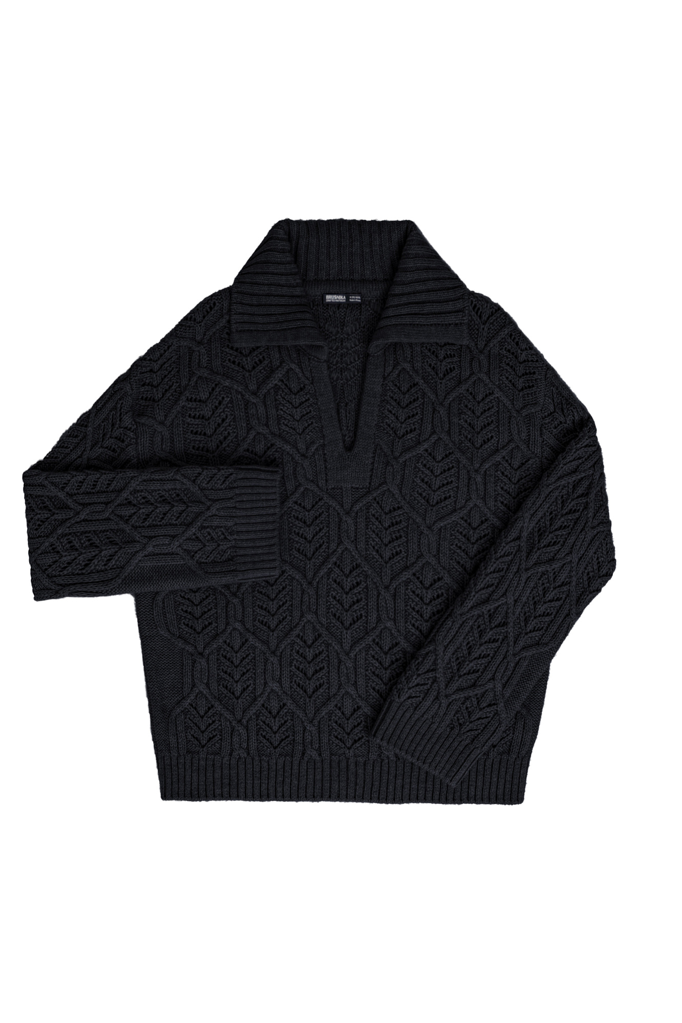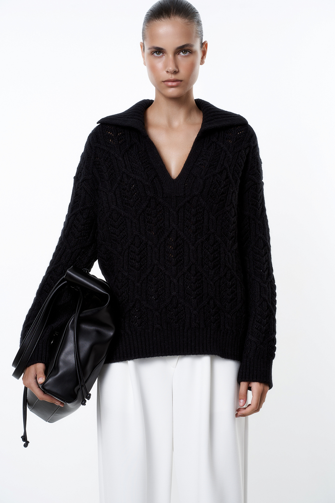 Трикотажный джемпер со сложной арнаментной вязкой с добавлением шерсти альпака. Модель свободного силуэта со спущенной линией плеча и воротником-поло с V-образным вырезом. Манжеты рукавов, воротник и низ изделия выполнен в рубчик.