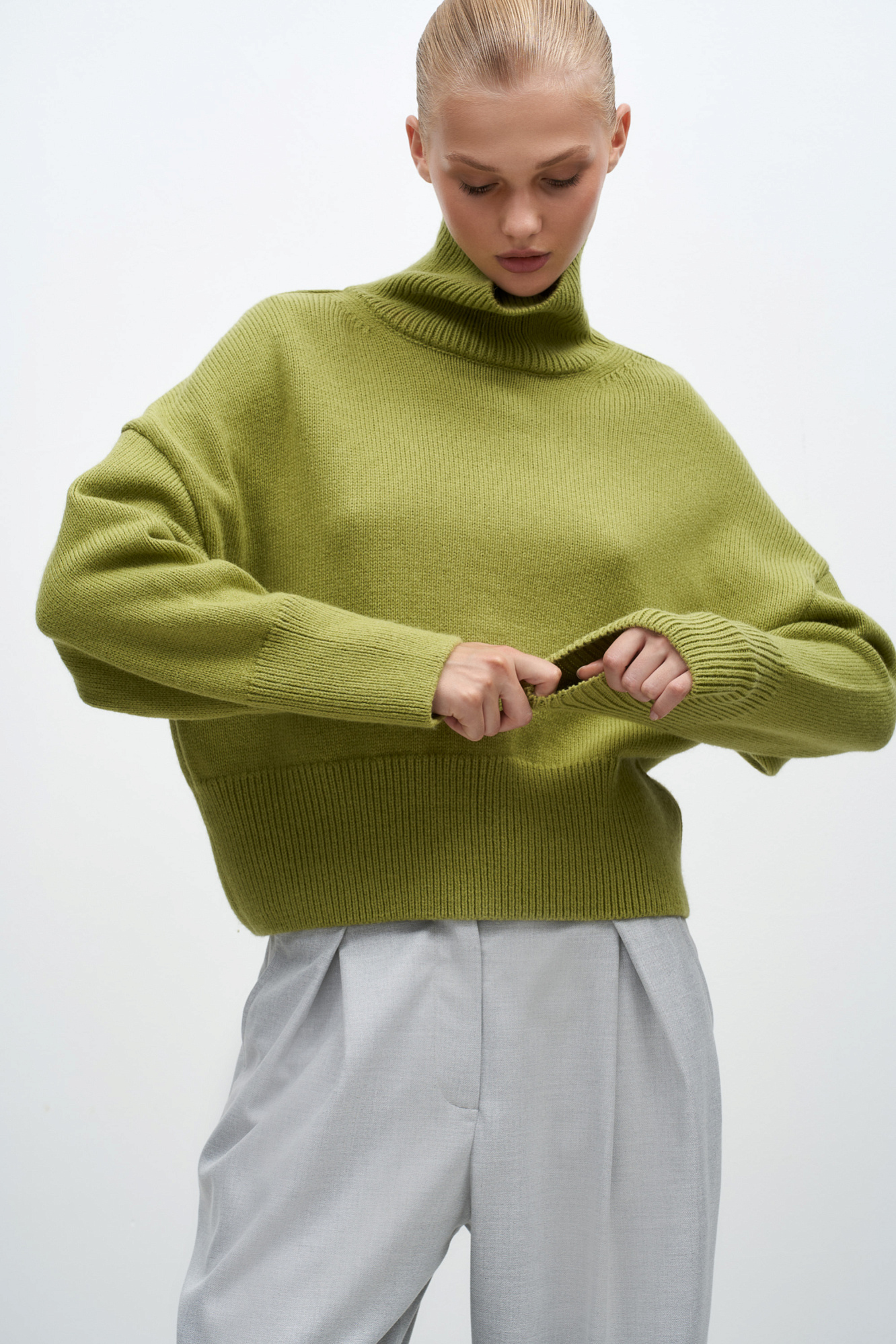 Трикотажный джемпер с шерстью альпака. Модель свободного силуэта с высоким воротником, спущенной линией плеча и длинными рукавами. Манжеты и низ изделия в рубчик.