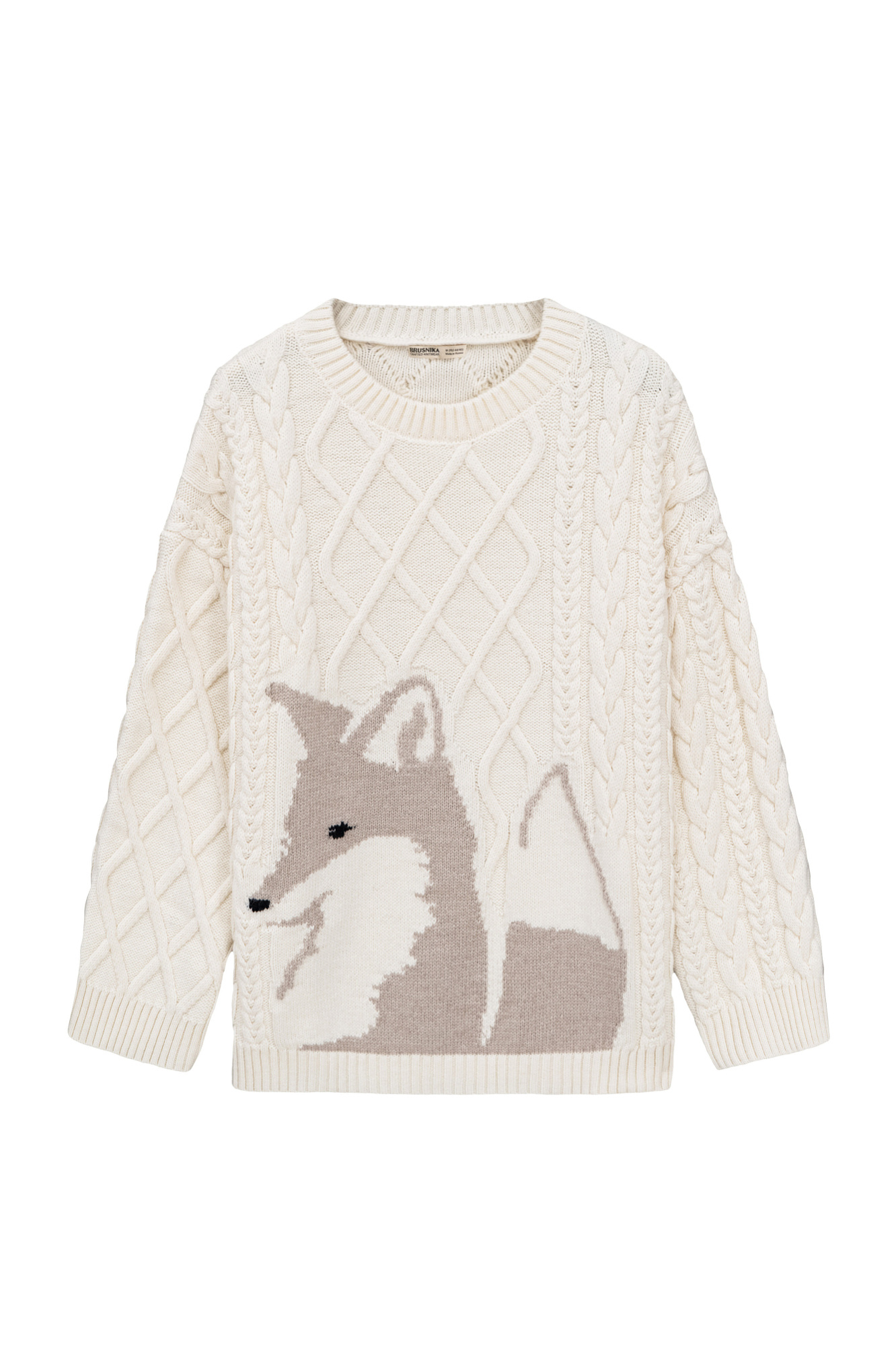 Трикотажный джемпер с жаккардовым рисунком. Модель свободного силуэта со спущенным плечом из шерсти альпака. Края изделия в рубчик.