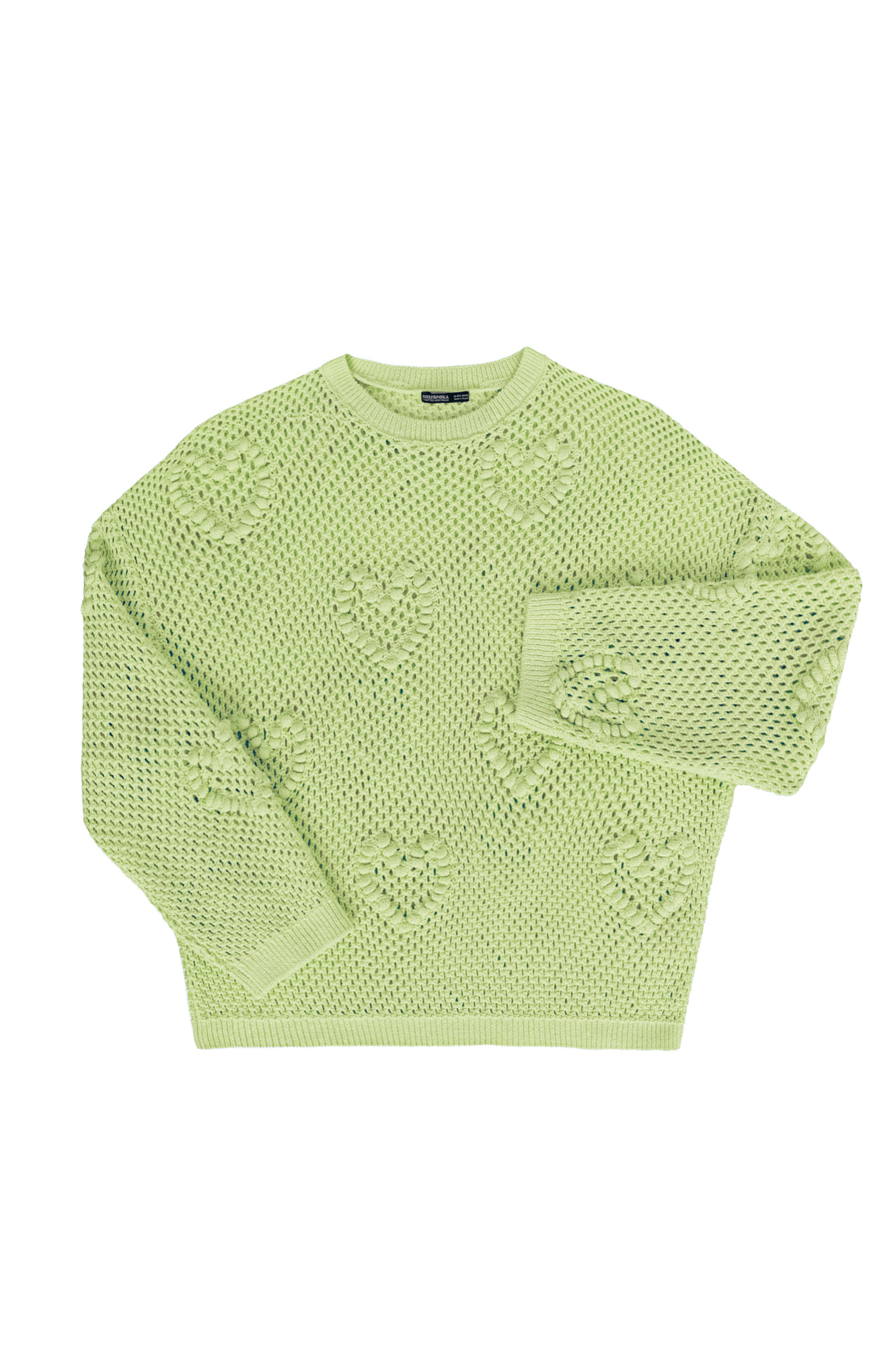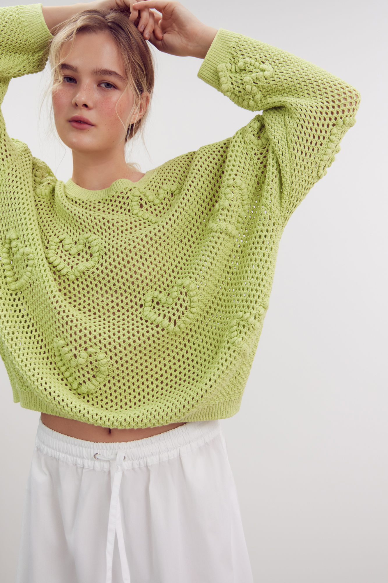 Трикотажный ажурный джемпер из хлопка. Модель свободного силуэта, со спущенной линией плеч, длинными рукавами и круглым вырезом горловины. Изделие декорировано объемными деталями в виде сердечек.