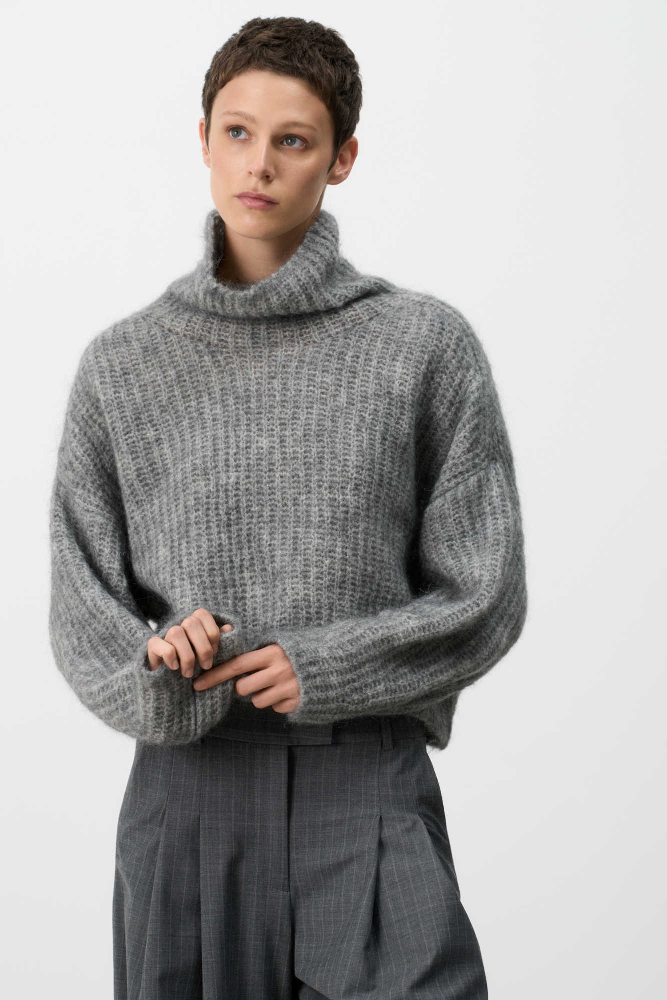 Трикотажный джемпер из мохера. Модель свободного силуэта со спущенной линией плеча и высоким объемным воротником.