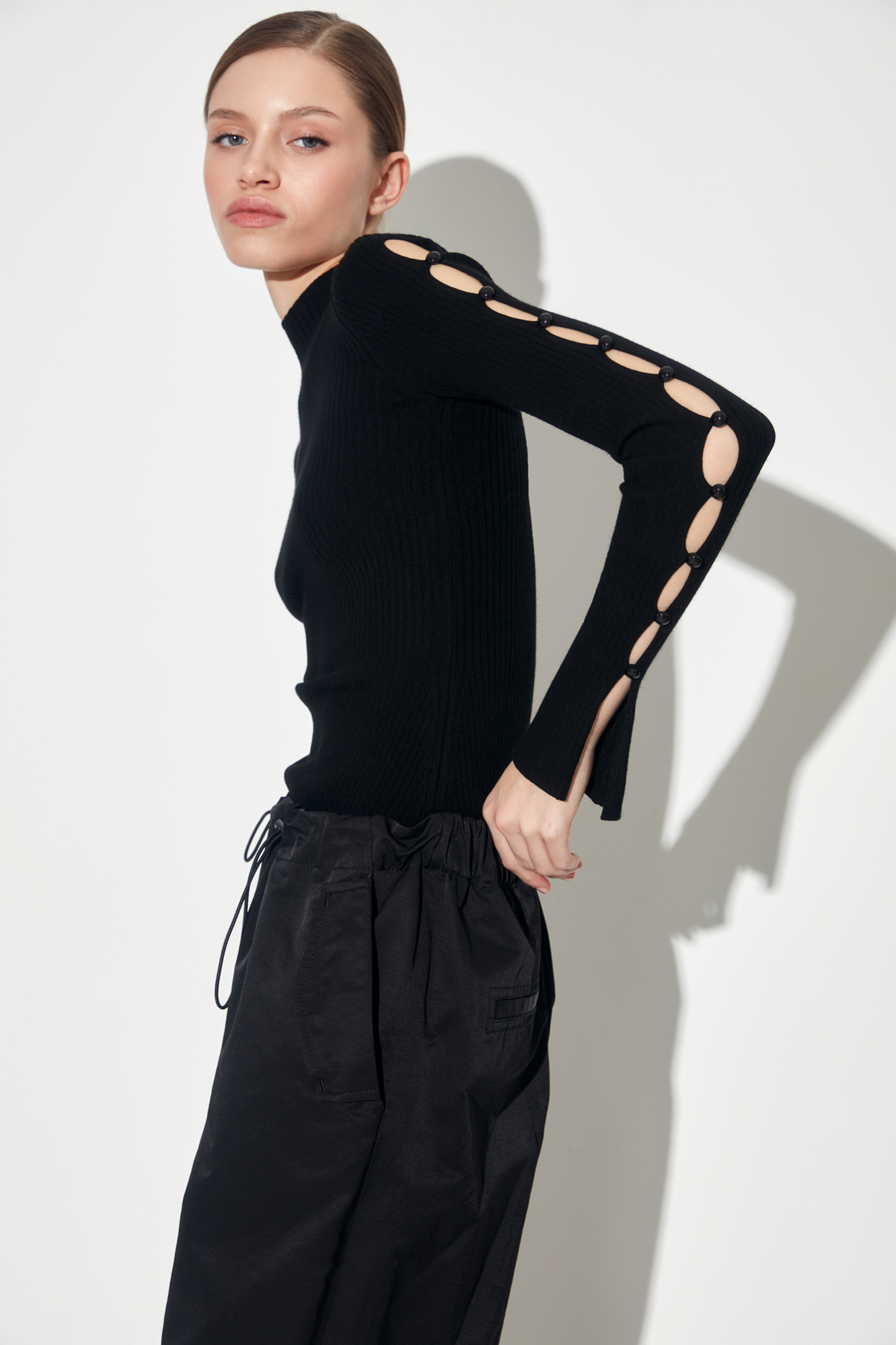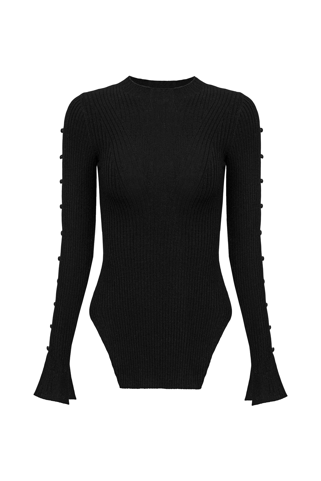 Трикотажный топ из вискозы. Модель приталенного силуэта, разрезами по бокам, с длинными рукавами на пуговицах, невысоким воротником-стойкой и декоративными сбавками на груди.