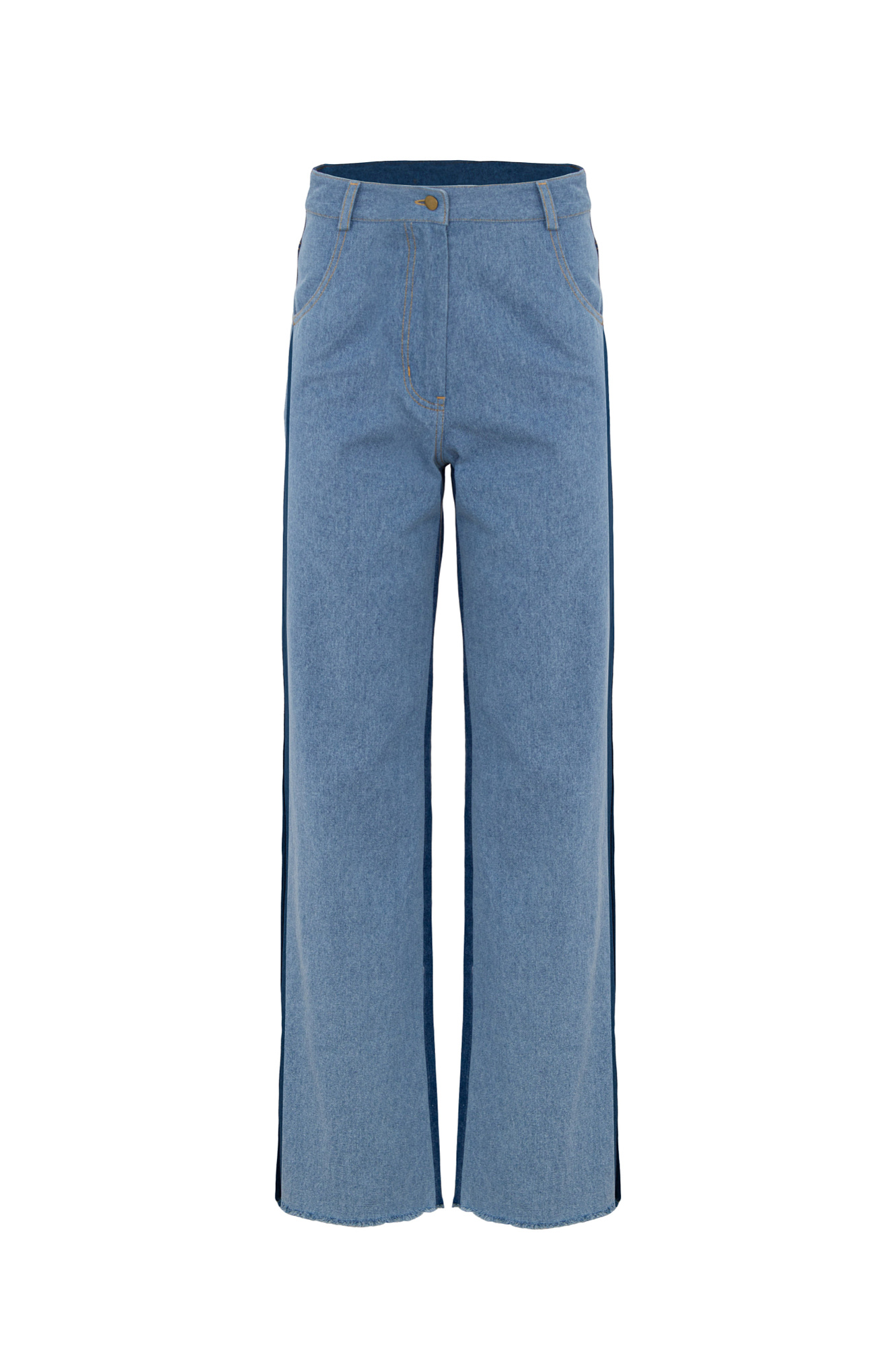 Комбинированные джинсы из 100% хлопка. Благодаря свободному крою и прямым брючинам очень удобны.Эта модель голубого цвета спереди и синего цвета сзади. Скрытая застежка на молнии и пуговице.