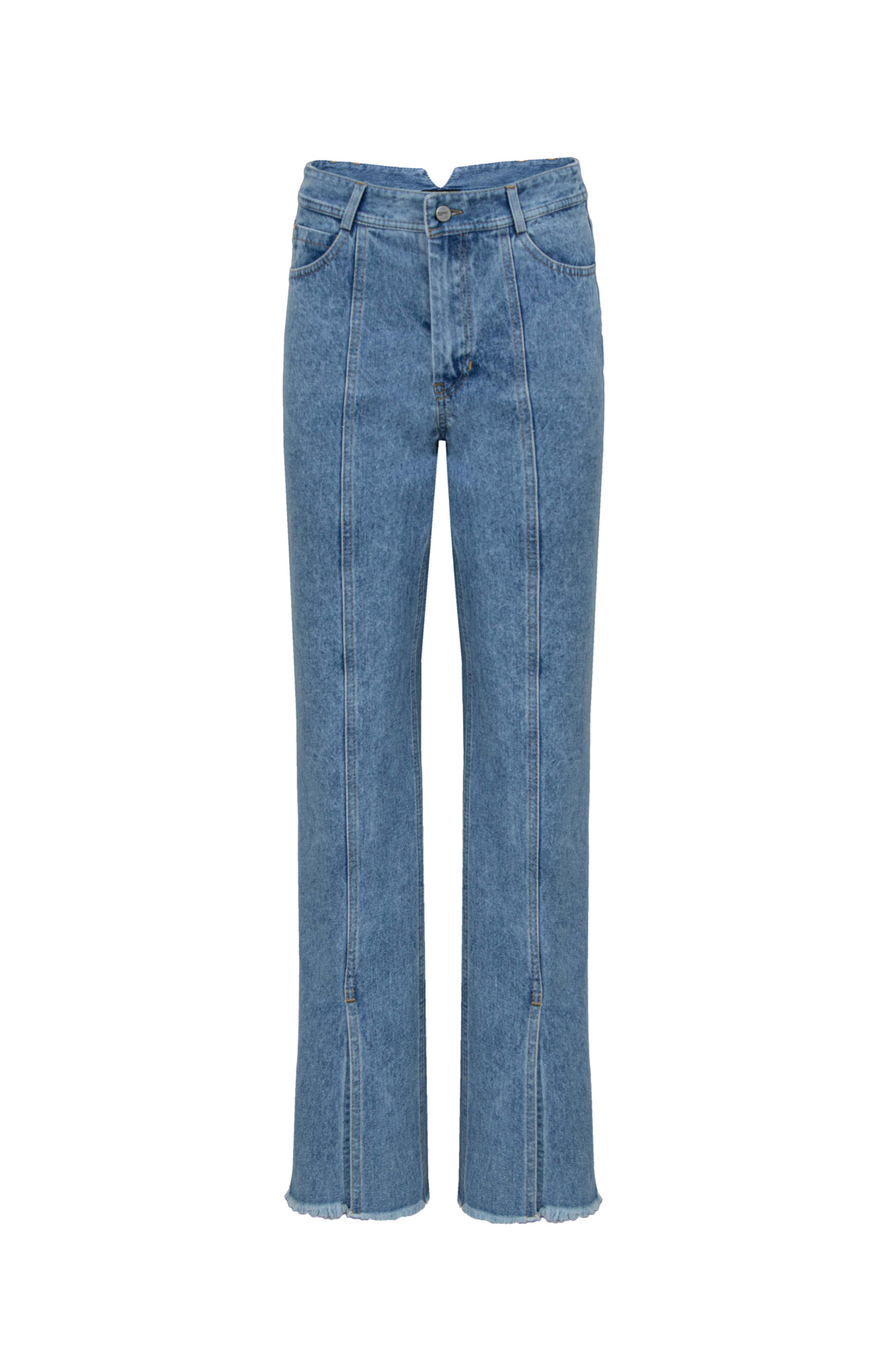 Прямые джинсы из 100% хлопка с разрезами спереди. Модель со средней посадкой и необработанным низом.