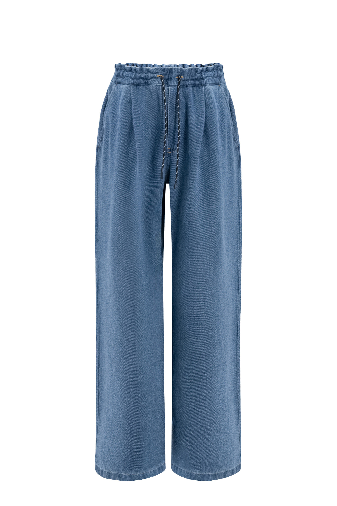 Джинсы на кулиске из 100% хлопка с текстурой в диагональный рубчик. Модель прямого кроя с высокой посадкой. 2 боковых кармана.