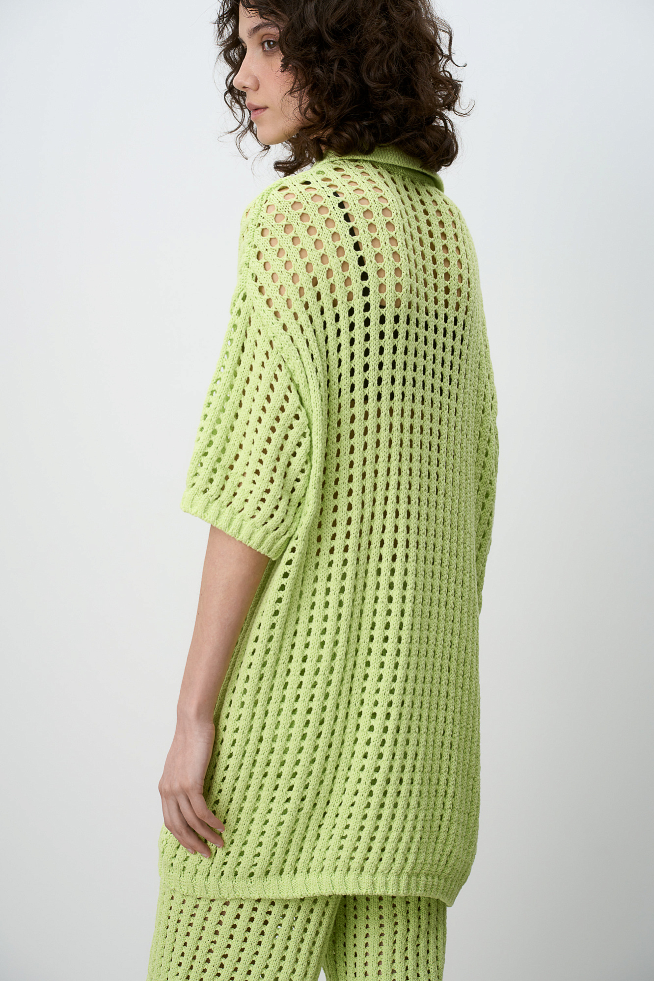 Трикотажная ажурная футболка из 100% хлопка. Модель со спущенным рукавом и воротником-поло. Дополнить образ можно шортами в таком же стиле.