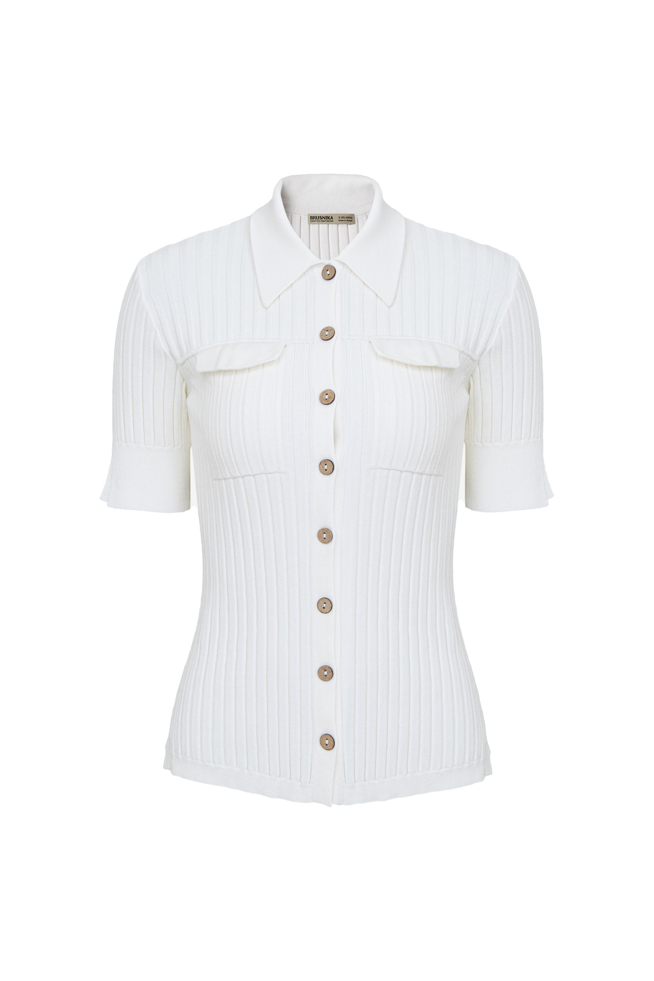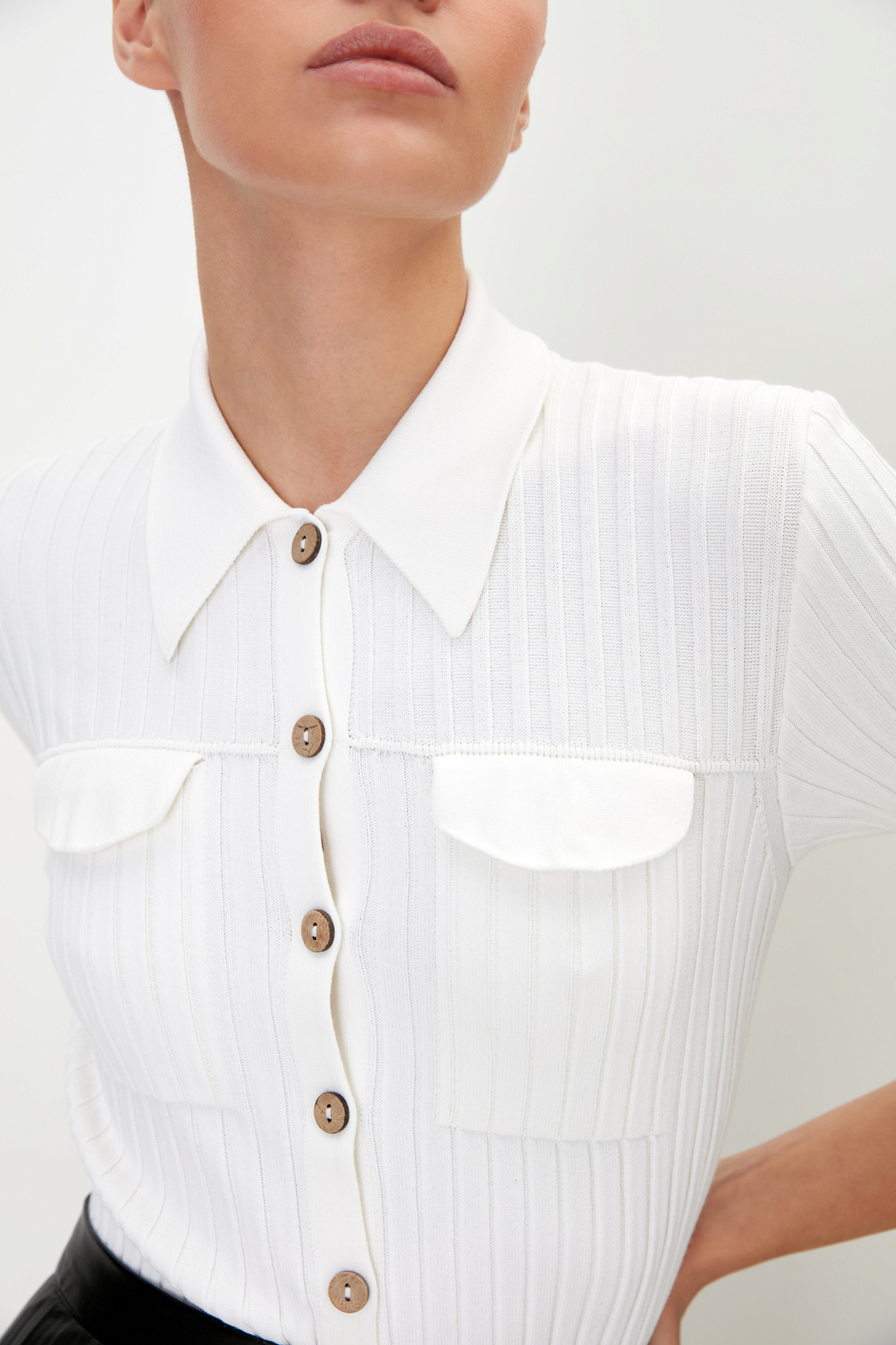 Трикотажная футболка из вискозы в широкий рубчик. Модель приталенного силуэта с отложным воротником, небольшими разрезами на манжетах и имитацией карманов на груди с клапанами. Застежка на пуговицы.