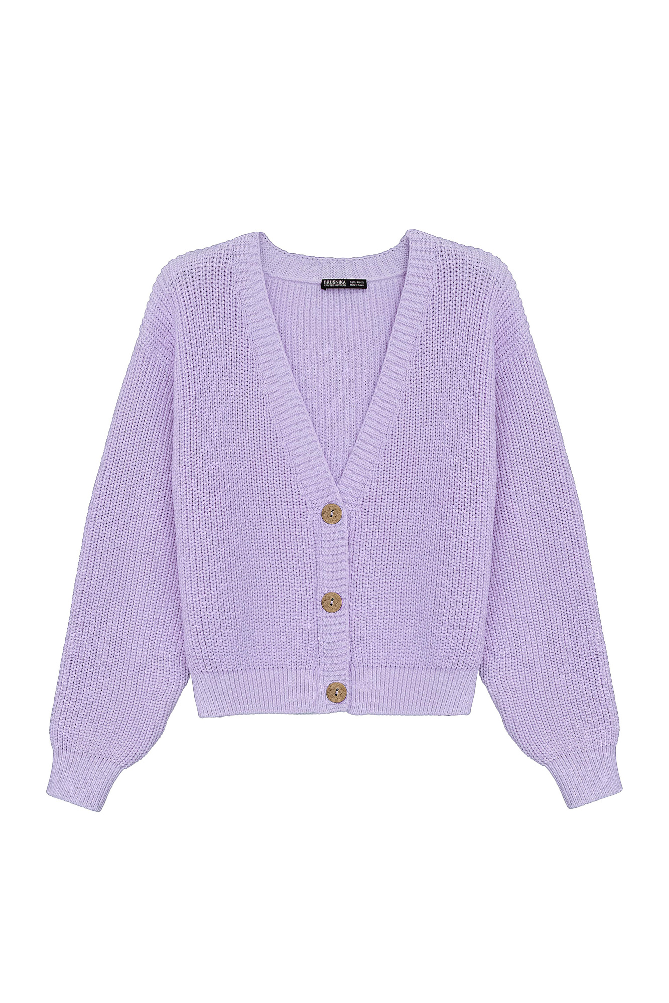 Хлопковый кардиган полуфанг с длинными рукавами. V-образный вырез, низ изделия и манжеты на эластичной ленте в рубчик.