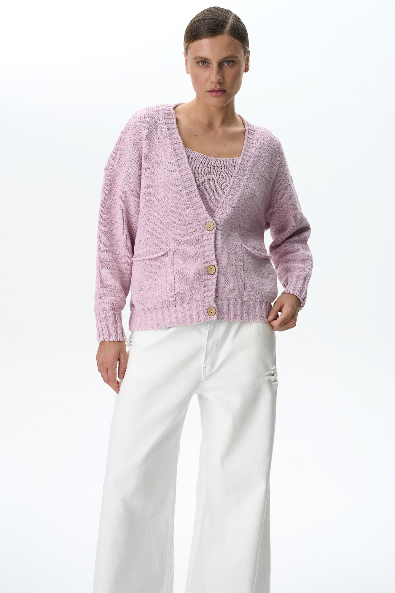 Удлинённый кардиган из хлопка на трёх пуговицах с двумя карманами.