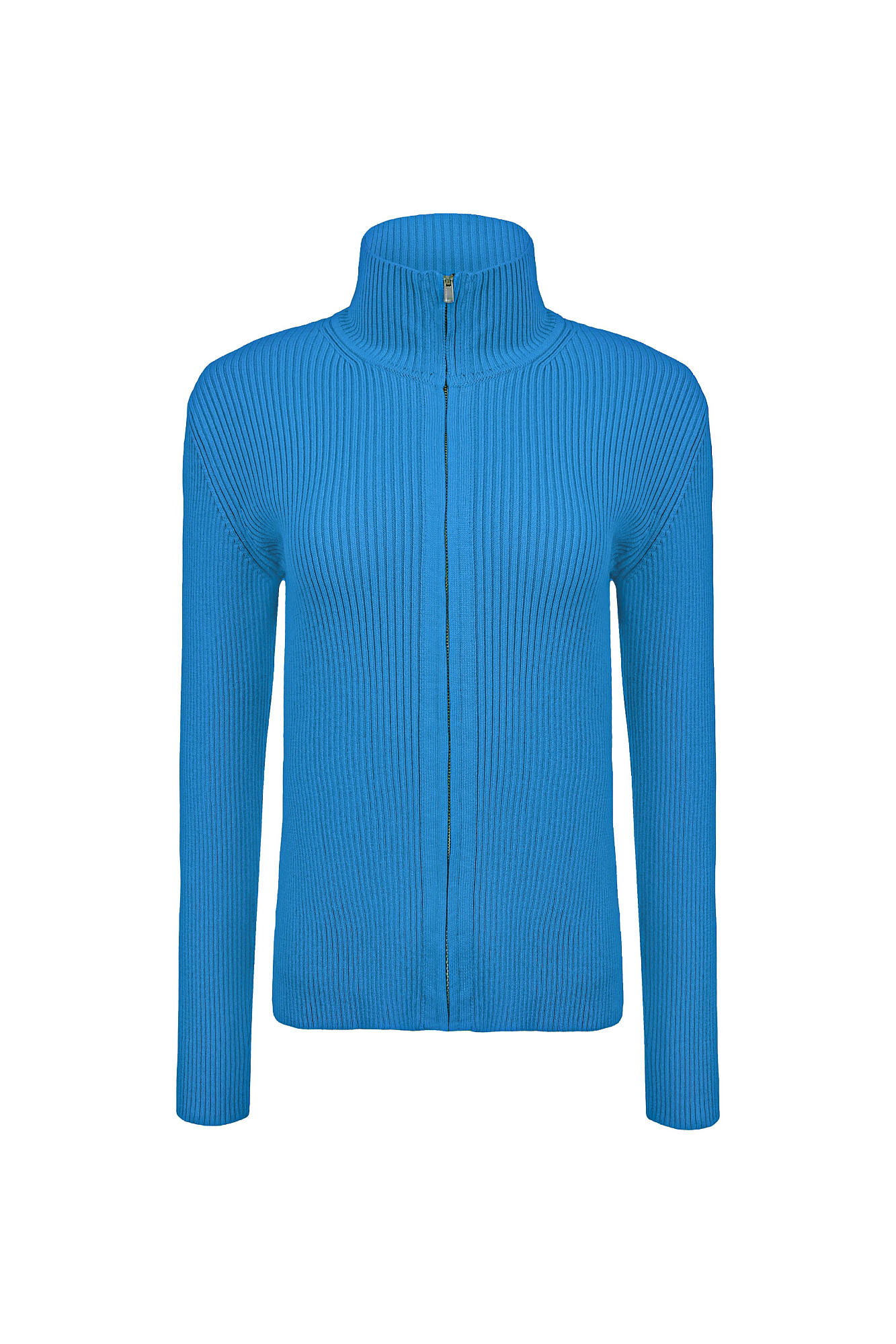 Трикотажный кардиган из 100% хлопка в рубчик. Воротник-стойка, застежка на молнию.