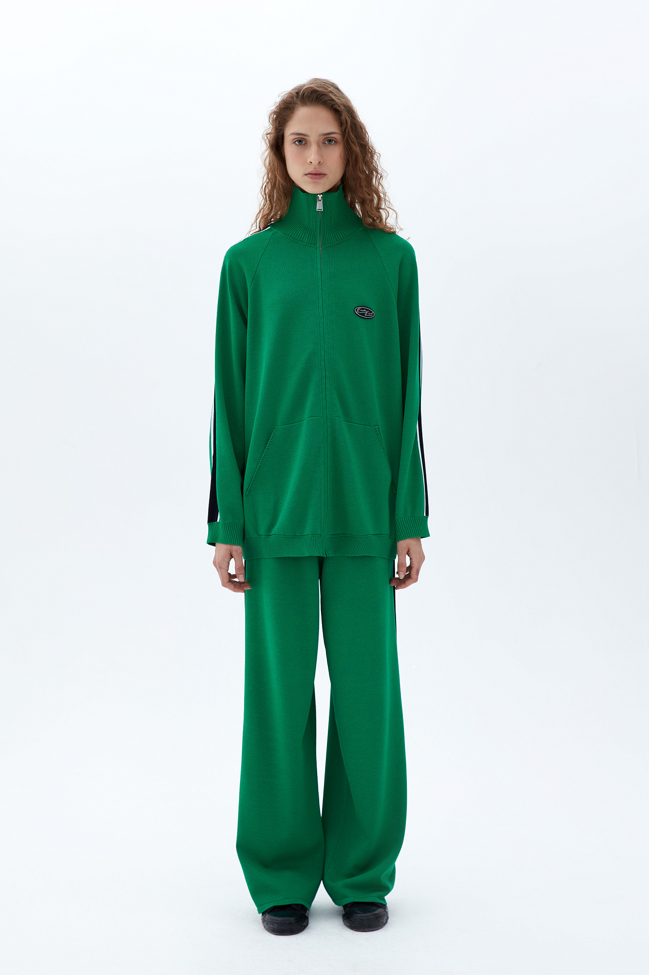Бомбер из вискозы с брендированным ярлыком на груди, двухцветным лампасом и боковыми карманами. Воротник-стойка, манжеты и низ изделия в рубчик. Дополнить образ можно брюками или шортами в таком же стиле.