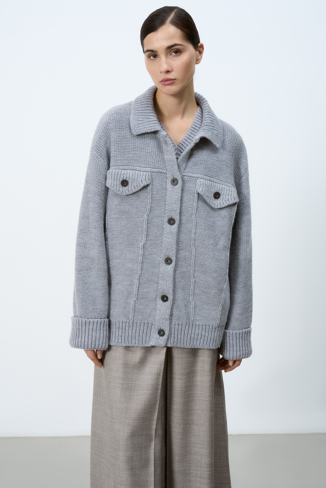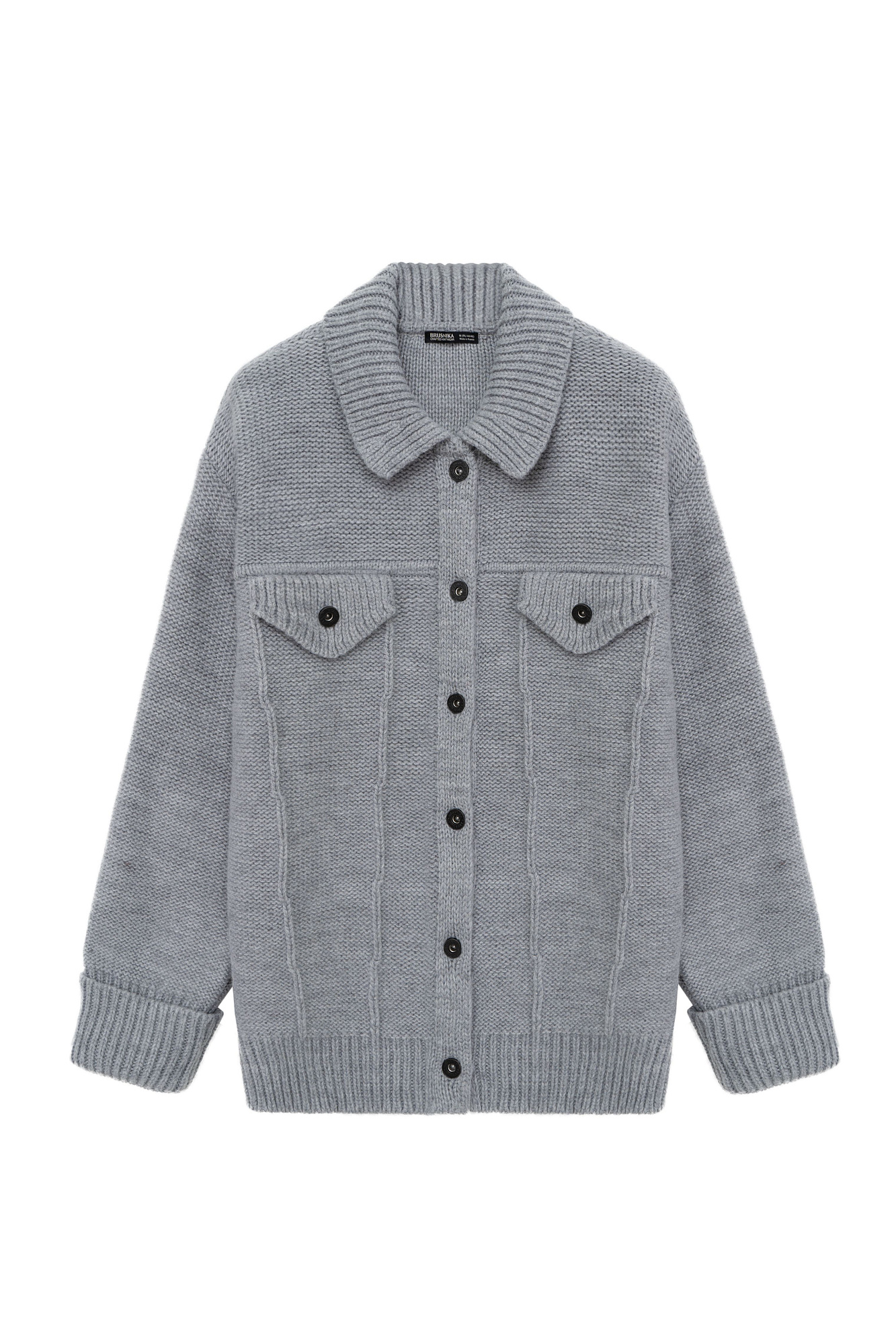 Трикотажный бомбер из смесовой шерсти с воротником поло. Модель свободного силуэта со спущенным плечом и карманами на груди. Края изделия в рубчик, застежка на пуговицы.