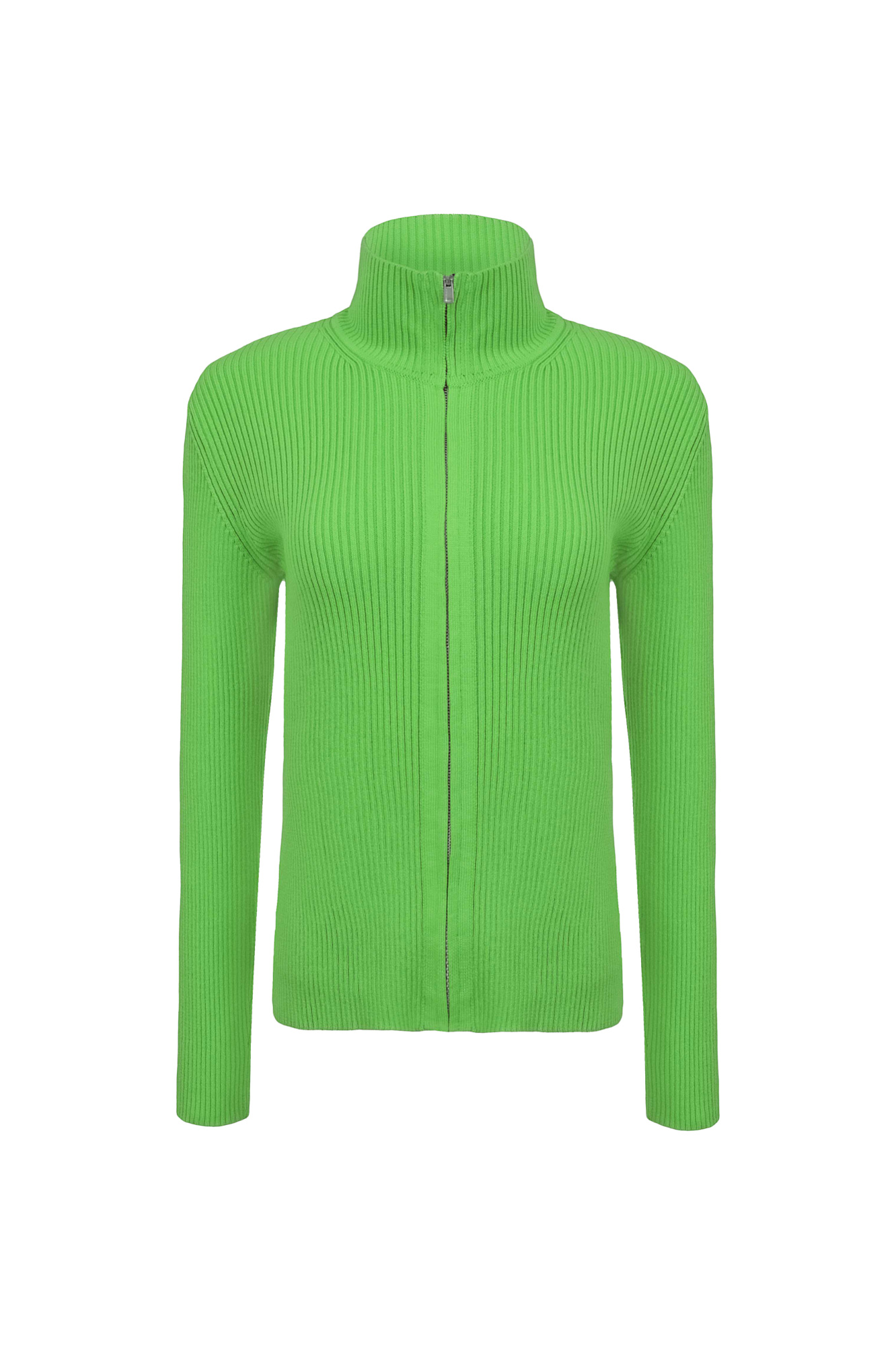 Трикотажный кардиган из 100% хлопка в рубчик. Воротник-стойка, застежка на молнию.